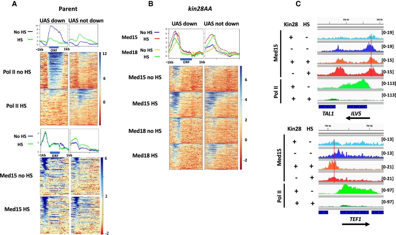 Mediator association persists at non-RP genes repressed by heat shock. (A) Heat maps and line graphs showing normalized occupancy of Pol II and Med15 at non-RP UAS genes (see text) having Pol II occupancy decreased by at least twofold upon heat shock (“UAS down”) (Supplemental Table S2) or having Pol II occupancy unchanged or increased upon heat shock (“UAS not down”) (Supplemental Table S2) in rapamycin-treated YFR1321, the parent strain to kin28AA yeast, with and without heat shock. (B) Heat maps and line graphs showing normalized occupancy of Med15 (tail) and Med18 (head) at “UAS down” and “UAS not down” genes in kin28AA yeast treated with rapamycin, with and without heat shock. (C) Browser scans showing Med15 and Pol II occupancy at ILV1 and TEF1 genes in kin28AA yeast (“−Kin28”) or the parent strain YFR1321 (“+Kin28”), both treated with rapamycin, with or without heat shock. Scale, in reads per million mapped reads, is indicated for each scan. Note that Pol II occupancy is reduced at both genes upon heat shock; the vertical dashed lines emphasize the shift of the Med15 peak toward the promoters only when Kin28 is depleted in the absence of heat shock.