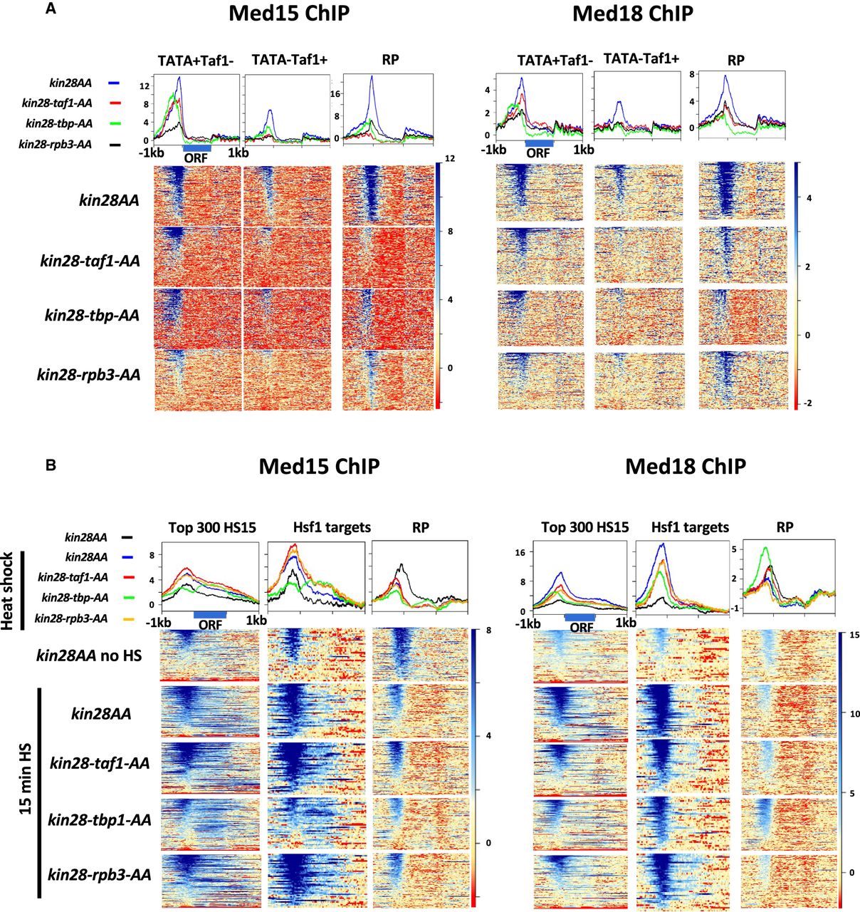 Effect of depleting PIC components on Mediator association with gene promoters. (A) Heat maps and line graphs showing normalized occupancy of Med15 (tail) and Med18 (head) at TATA-containing, Taf1-depleted promoters from the 1000 genes with highest Pol II occupancy (228 genes); TATA-less, Taf1-enriched genes excluding RP genes from the 1000 genes with highest Pol II occupancy (330 genes); and RP genes after depletion of Kin28 alone or together with Taf1, TBP, or Rpb3, as indicated. (B) Heat maps and line graphs showing normalized occupancy of Med15 (tail) and Med18 (head) at the approximately 300 genes with highest Pol II occupancy after heat shock, Hsf1 targets, and RP genes after depletion of Kin28 alone or together with Taf1, TBP, or Rpb3, as indicated, without or with 15 min of heat shock, as indicated.