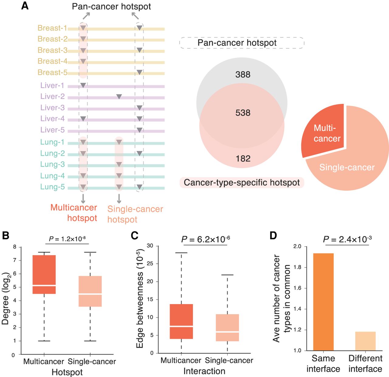 Association of cancer-type-specific hotspots with specific protein interactions. (A) Categorization of pan-cancer versus cancer-type-specific hotspots and multicancer versus single-cancer hotspots. (B) Degree distributions of proteins harboring multicancer and single-cancer hotspots. Degree values are transformed by log2 for presentation purposes. (C) Edge betweenness distributions of multicancer and single-cancer interactions. (D) Average number of cancer types shared between hotspots on the same interface and between hotspots on different interfaces.