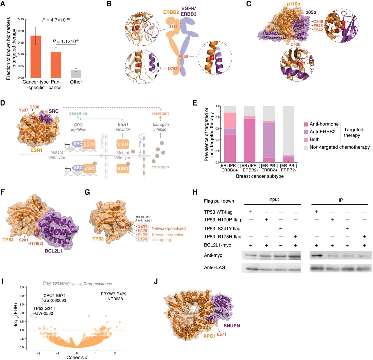 Clinical significance of network-prioritized hotspots in targeted therapy. (A) Association of our network-prioritized hotspots with known genetic biomarkers in targeted therapy. (B) Known biomarkers on the interface of ERBB2 dimers. Interfaces were determined by structural analysis of ERBB2(S310)-ERBB3 (homology model; PDB template: 3N85), ERBB2(V659)-EGFR (cocrystal structure; PDB ID: 2KS1), and ERBB2(D769)-ERBB3 (homology model; PDB template: 4RIX). (C) Known biomarkers on the interface between PIK3CA and PIK3R1 (cocrystal structure; PDB ID: 4OVU). (D) Known resistant biomarkers on the interface between ESR1 and SCR (cocrystal structure; PDB ID: 4MG8). The ESR1 interface mutations render resistant to antiestrogen treatment but are sensitive to SRC inhibitors, especially when coadministered with an ESR1 inhibitor. (E) Prevalence of targeted therapy in different breast cancer subtypes. (F) A cocrystal structure of TP53–BCL2L1 (PDB ID: 2MEJ) highlighting the TP53 H179 and S241 interface hotspots. (G) Cocrystal structure of TP53 (PDB ID: 2H1L) highlighting a 3D cluster formed by our network-prioritized hotspots (red) and known interaction-disrupting mutation residues (orange). (H) Coimmunoprecipitation validating the disruptive effects of our network-prioritized hotspot mutations TP53 H179P and S241Y, along with a previously reported oncogenic mutation R175H in 3D proximity, on the TP53–BCL2L1 interaction in HEK 293T cells. (I) Drug responses of cancer cell lines harboring network-prioritized hotspots. Known therapeutic biomarkers were excluded from the analysis toward identifying potentially novel targets. Each point denotes a specific hotspot-drug pair, for which the difference in drug response was evaluated by an analysis of variance (ANOVA) model. P-values were corrected by the Benjamini–Hochberg method (with red dashed line indicating a false-discovery rate [FDR] of 0.1). Effect sizes were quantified using a Cohen's d statistic. (J) Cocrystal structure of XPO1–SNUPN interaction (PDB ID: 5DIS) highlighting a prioritized interface hotspot XPO1 E571 that presented significant drug sensitivity.