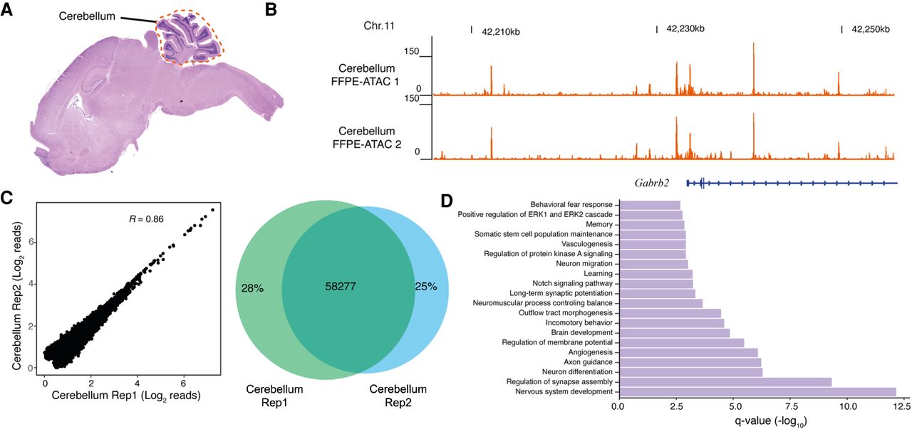FFPE-ATAC decodes chromatin accessibility from the mouse cerebellum with the aid of hematoxylin and eosin (H&E) staining. (A) H&E staining of a mouse FFPE brain tissue section, where the location of the cerebellum is illustrated with a dotted line. (B) Genome browser tracks of results from FFPE-ATAC analyses of isolated mouse FFPE cerebellum. (Chr.) Chromosome. (C) Reproducibility of FFPE-ATAC analyses of mouse FFPE cerebellum. (Left) The genome-wide correlation from the FFPE-ATAC reads. (Right) The overlapping peaks from the FFPE-ATAC in the two technical replicates. (R) Pearson's correlation. (D) Enrichment of Gene Ontology terms for the top 10,000 FFPE-ATAC peaks for the mouse FFPE cerebellum.