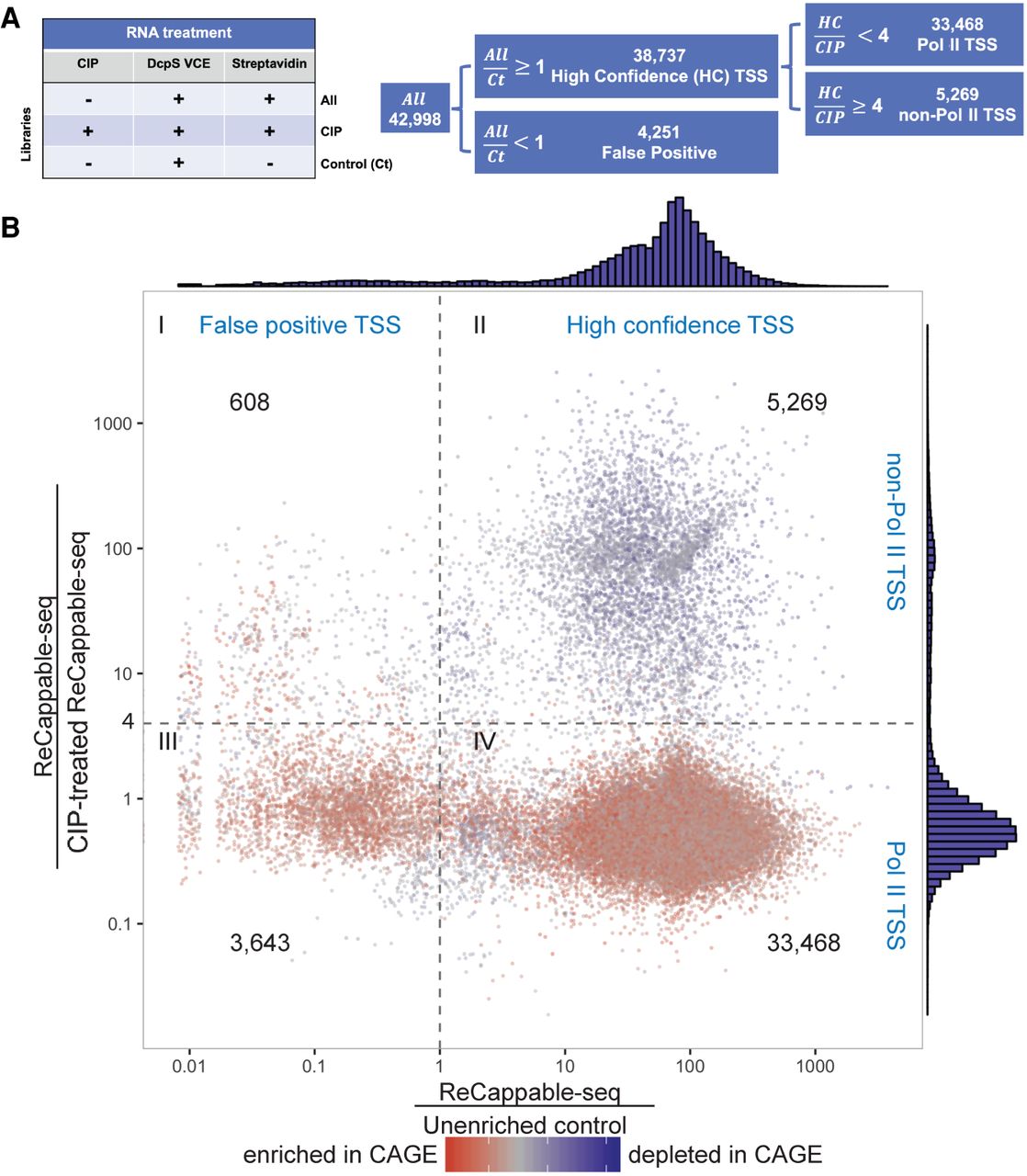 Overview of the sequencing result. (A) Summary of sequencing experiments: Experiments were performed, resulting in three data set types: ReCappable-seq (ALL), CIP-treated ReCappable-seq (CIP), and a unenriched control for which the streptavidin step has been omitted (Ct). ALL corresponds to the ReCappable-seq data set without CIP treatment and defines 42,988 candidate TSSs. Comparison of ALL with Ct enables the definition of 38,737 high-confidence (HC) TSSs. Comparison of HC with CIP enables the definition of HC Pol II TSSs (33,468) and the HC non–Pol II TSSs (5269). (B) Candidate TSS positions (42,988) are distributed according to the TPM ratio between ALL and Ct (x-axis) and the TPM ratio between ALL and CIP (y-axis). Dotted lines define four quadrants as follows: ALL ÷ CIP less than four (Pol II TSS), ALL ÷ CIP above or equal to four (non–Pol II TSS), ALL ÷ Ct above or equal to one (HC TSS), and ALL ÷ Ct less than one (false-positive TSS). Colors denote the ratio between ALL and CAGE with red (enriched in CAGE relative to ReCappable-seq) and blue (depleted in CAGE relative to ReCappable-seq).