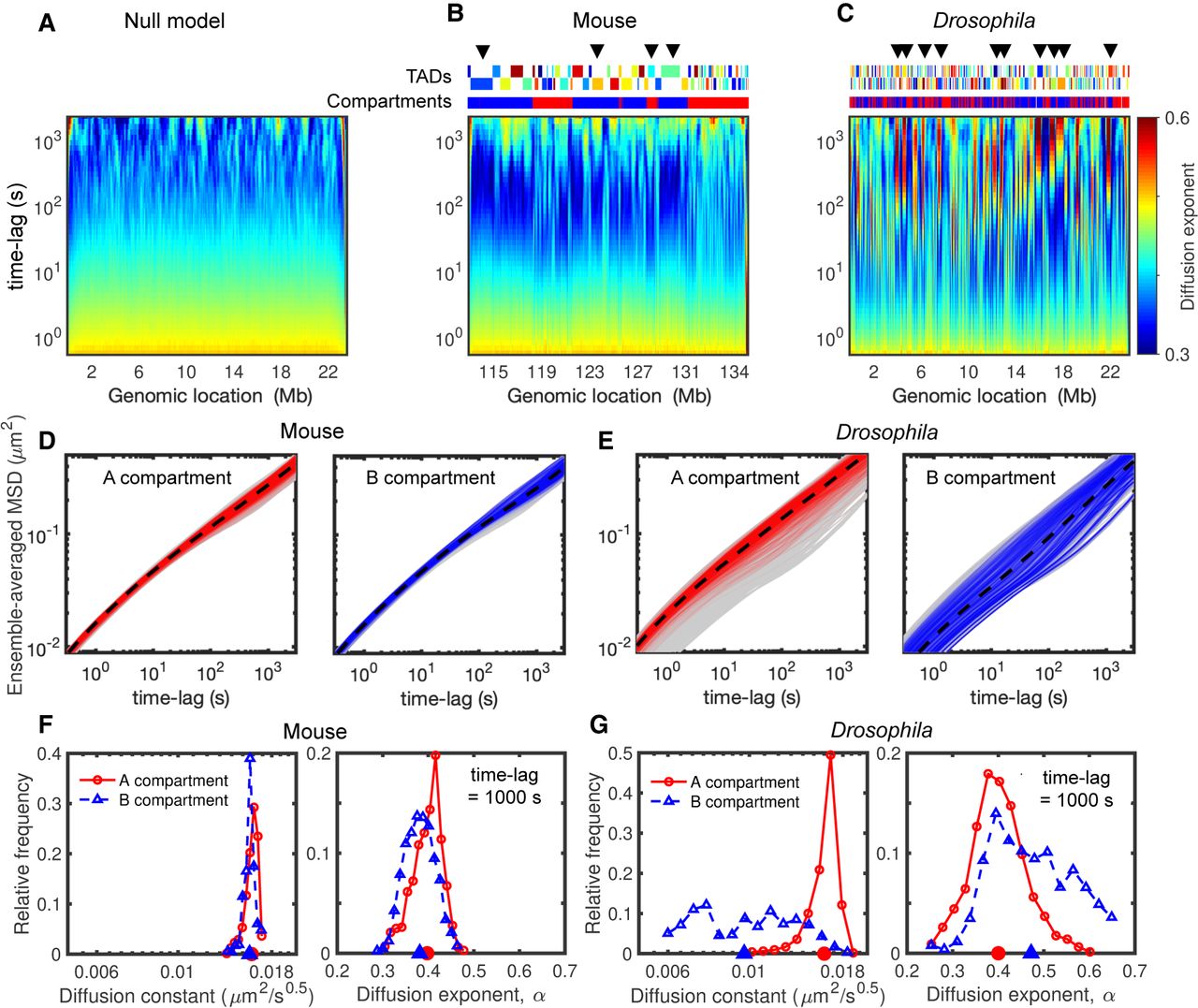 Heterogeneity in dynamics and its relationship with compartments. (A–C) Time evolutions of diffusion exponents along the genome for null model (A), mouse (B), and Drosophila (C), calculated by the derivatives of logarithmic MSD curves (Fig. 3G–I; Methods). The upper tracks in B and C show the corresponding TADs and compartments, and arrows highlight some regions with anomalous behaviors (nonmonotonic evolutions). (D) MSD curves of the monomers in A (left) and B (right) compartments in the mouse case. The dashed black curves show the average MSDs over all loci in the same compartment, and gray shaded areas are MSDs of all monomers. (E) As in D but for the Drosophila model. (F) The distributions of diffusion constant (left) and exponent (right) at 1000-sec time lag for the monomers in A (red) and B (blue) compartments in the mouse case. Their average values are indicated on the horizontal axes. (G) As in F but for Drosophila simulations.