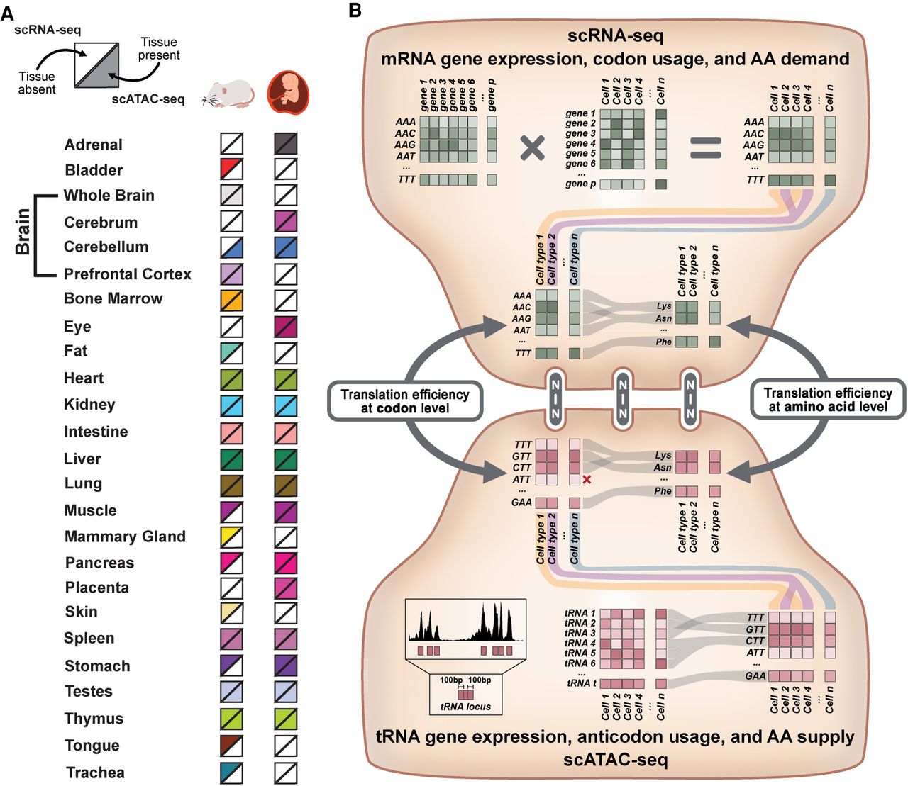 Overview of the approach for single-cell analysis of translation efficiency. (A) To examine a diverse set of cell types across multiple tissues, scRNA-seq and scATAC-seq atlases produced for mouse and human were analyzed. For both organisms, each square is color-filled if scRNA-seq (top half) or scATAC-seq data (bottom half) are present. (B, top) mRNA gene expression, codon usage, and amino acid (AA) demand can be quantified using single-cell RNA sequencing (scRNA-seq). Each gene's sense codon frequencies are weighted by gene expression counts. Codon usage from individual cells is pooled at the cell-type level and can be combined based on AA demand. (Bottom) tRNA gene expression, anticodon usage, and AA supply can be quantified using the single-cell assay for transposase accessible chromatin (scATAC-seq). First, the Tn5 transposase insertions mapping within tRNA gene loci and their surrounding 100-bp flanking regions are quantified, creating a tRNA gene expression matrix. Cells are pooled at the cell-type level and can be combined into anticodon isoacceptor families and AA isotypes. (Center) scRNA-seq and scATAC-seq data can be integrated to calculate a tTE score. For more detailed description, see Methods section.