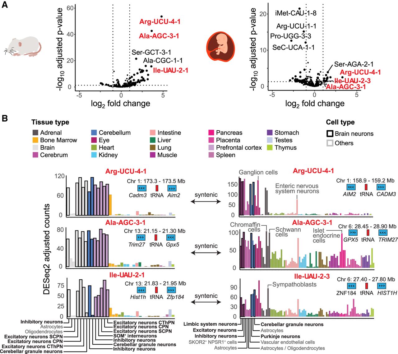 Some tRNA genes are enriched in brain neurons and conserved in the mouse and human. (A) Volcano plots show individual tRNA gene usage between brain neurons and all other cell types, displaying −log10 adjusted P-values and log2 FC, as determined using DESeq2. Red labels indicate syntenic tRNA genes significantly enriched in brain neurons in both the mouse (left) and human (right). Vertical lines indicate a FC >100%. (B) Bar plots show expression of syntenic, neuron-enriched tRNA genes. Each bar corresponds to a cell type filled according to the tissue type (top) and with border shading for brain neuron (black) and others (gray). Brain cell types (bottom), genomic location of the tRNA gene (red) with flanking protein-coding genes (blue) (top), and direction of gene transcription (arrows) are indicated.