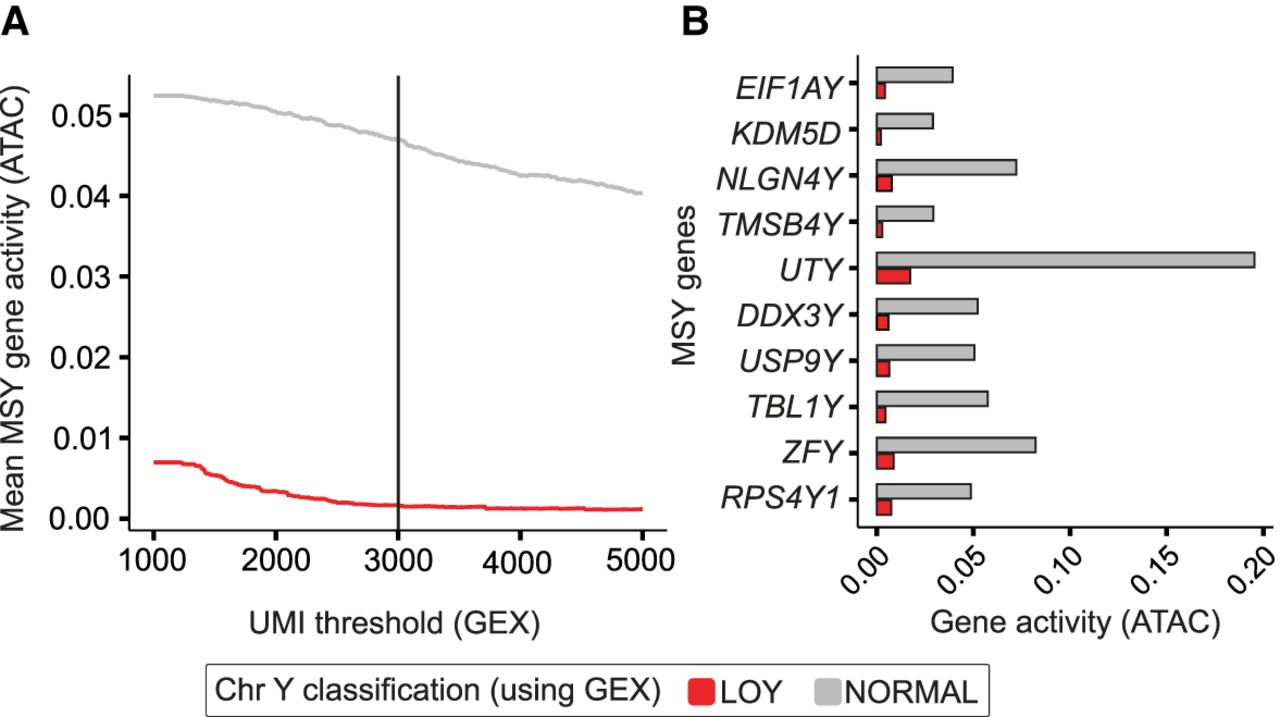 Setting UMI depth quality-control thresholds using multimodal assays. (A) Mean gene activity (snATAC-seq) of LOY and non-LOY/normal nuclei (classified using snRNA-seq) as the minimum UMI count threshold is increased (snRNA-seq). Black line indicates the UMI depth threshold used in subsequent LOY analyses (more than 3000 UMI). (B) Mean gene activity of each detected MSY gene for LOY (red) and non-LOY/normal nuclei (gray).