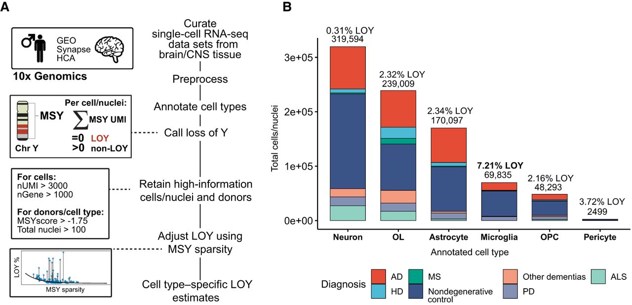 Summary of brain LOY analysis workflow and combined sc/snRNA-seq brain data set. (A) Summary of methods used to estimate LOY in the brain. For additional information, see Supplemental Figure S2 and Methods. (B) Total number of included cells/nuclei annotated to each major brain cell type, colored by neurodegenerative diagnosis. Total nuclei/cell sample size and net LOY frequency are listed above each bar. Only droplet-based 10x Genomics sc/snRNA-seq data sets were considered for the study. Cells/nuclei with more than 3000 UMI counts and more than 1000 genes were included in LOY frequency analysis.