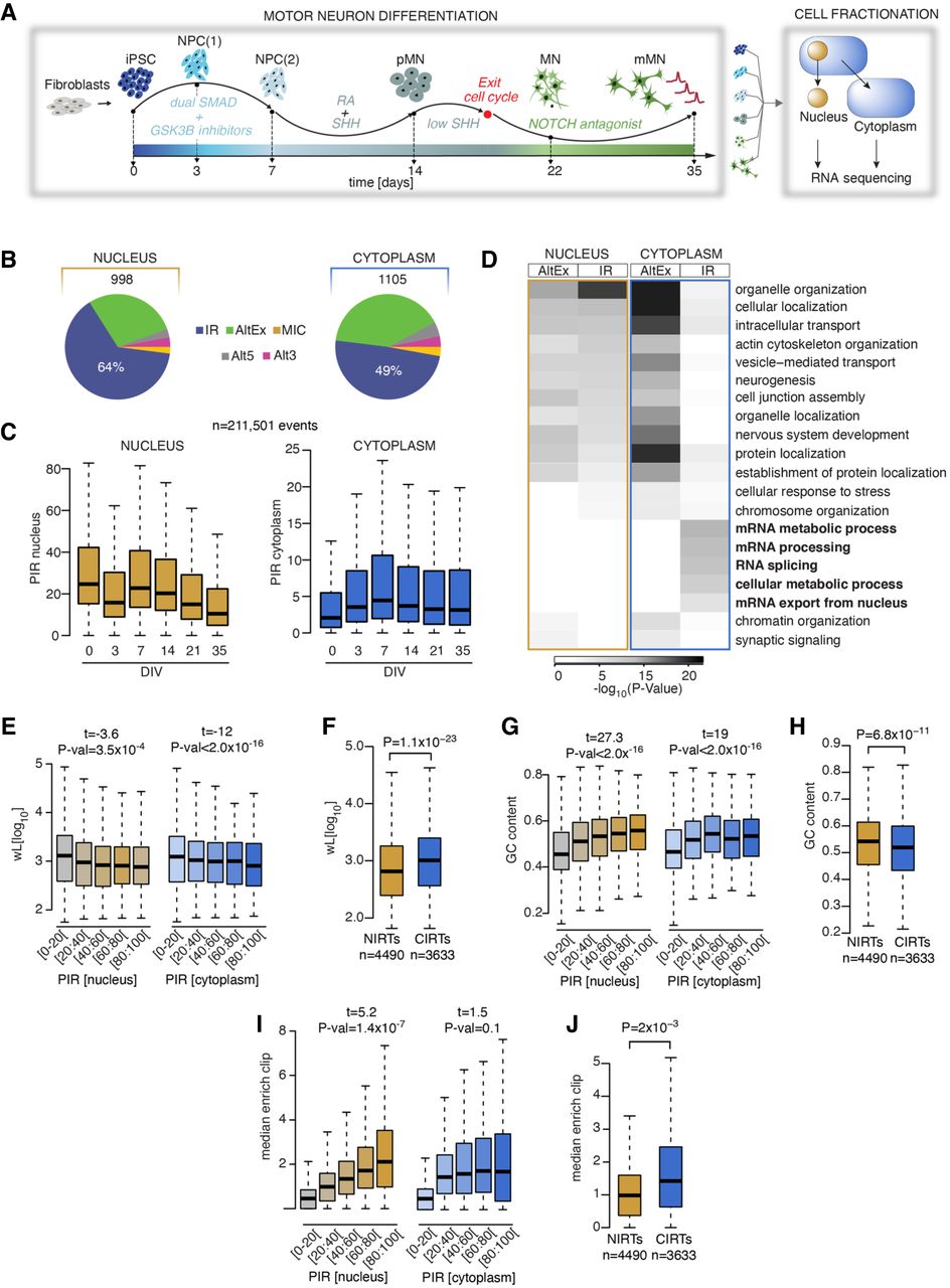 Nuclear and cytoplasmic intron retention (IR) affect two distinct mRNA subsets. (A) Schematic depicting the induced-pluripotent stem cell (iPSC) differentiation strategy for motor neurogenesis. Arrows indicate sampling time points in days when cells were fractionated into nuclear and cytoplasmic compartments before poly(A) RNA sequencing. Four iPSC lines were obtained from four independent healthy controls. (NPCs) Neural precursors, (pMNs) “patterned” precursor motor neurons (ventral spinal cord), (MNs) postmitotic but electrophysiologically inactive motor neurons, and (mMNs) electrophysiologically active MNs. (B) Pie charts representing proportions of pooled included splicing events in healthy control samples from distinct stages of motor neurogenesis compared with iPSCs or with a previous time point in nuclear (left) and cytoplasmic (right) fractions. Total number of events are indicated above the charts. (AltEx) Alternative exon, (MICs) microexons, and (Alt5 and Alt3) alternative 5′ and 3′ UTR. (C) Comparison of the percent intron retention (PIR) during MN differentiation in nucleus (left) and cytoplasm (right) for 21,161 events that show >10% PIR in at least three out of 47 nuclear samples. (D) Heatmap of the GO biological functions enriched among the genes showing AltEx or IR in either the nucleus or the cytoplasm. P-values obtained by Fisher's exact test. (E) Analysis of the relationship between intron length (wL) and the PIR in the nucleus (left) and the cytoplasm (right). P-values obtained from analysis of variance (see Methods). Retained introns are grouped in five categories of increasing level of retention, as indicated on the x-axis. (F) Comparison of intron length (wL) between nuclear and cytoplasmic retained introns. Nuclear retained introns are defined as introns showing >20% IR in the nuclear fraction and <5% IR in the cytoplasmic fraction. Cytoplasmic retained introns are defined as introns showing >20% IR in the nuclear fraction and >15% IR in the cytoplasmic fraction. P-values obtained from Mann–Whitney U test. (G) Analysis of the relationship between the PIR in the nucleus and %GC content. Data shown as in E. (H) Comparison of %GC content between nuclear and cytoplasmic retained introns. (I) Analysis of the relationship between the PIR in the nucleus and the median enrichment for RBP binding site, compared with the nonretained introns of the same gene. Data shown as in E. (J) Comparison of median enrichment for RBP binding sites between nuclear and cytoplasmic retained introns. (C,E–J) Data shown as box plots in which the center line is the median; limits are the interquartile range; and whiskers are the minimum and maximum.