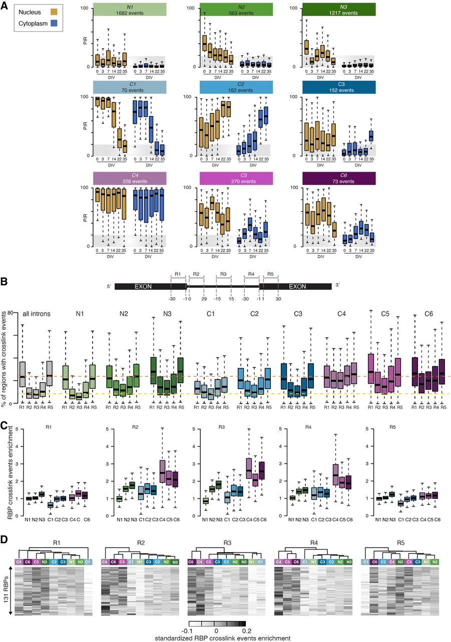 A spatiotemporal taxonomy reveals cytoplasmic IRTs with distinct RBP binding profiles. (A) Comparison of the nuclear and cytoplasmic PIR distributions for nine groups of retained introns showing distinct spatiotemporal dynamics during MN differentiation as identified using SVD (see Methods). N1, N2, and N3 contain introns primarily retained in the nuclear compartment, whereas the remaining six groups (C1–C6) contain introns with significant detection in the cytoplasm. Gold boxes indicate nucleus; blue boxes, cytoplasm. Gray area indicates the range of PIR values for which an intron is considered nonretained. (B, top) Schematic depicting the selected splicing regulatory regions juxtaposing the splice sites, namely, the last 30 nucleotides (nt) of the upstream exon (R1), the first 30 nt of 5′ intron region (R2), the 30 nt in the middle of the intron (R3), the last 30 nt of 3′ intron region (R4), and the first 30 nt of downstream exon (R5). (Bottom) Distributions of the percentage of regions in each group of introns that are mapped by at least one cross-link event for each of the available 131 RBPs. (C) Distribution of the enrichments in cross-link events in each of the selected regions R1, R2, R3, R4, and R5 for the available 131 RBPs across the nine categories of introns. Enrichment is obtained by dividing the fraction of regions from the group of interest with at least one cross-link event with the fraction of regions from the complete set of introns (n = 61,872) with a cross-link event. (D) Heatmaps of the enrichment scores of the cross-linking events for 131 RBPs in the R1, R2, R3, R4, and R5 regions for the nine groups of introns hierarchically clustered using Manhattan distance and Ward clustering. Data shown as box plots in which the center line is the median; limits are the interquartile range; and whiskers are the minimum and maximum.