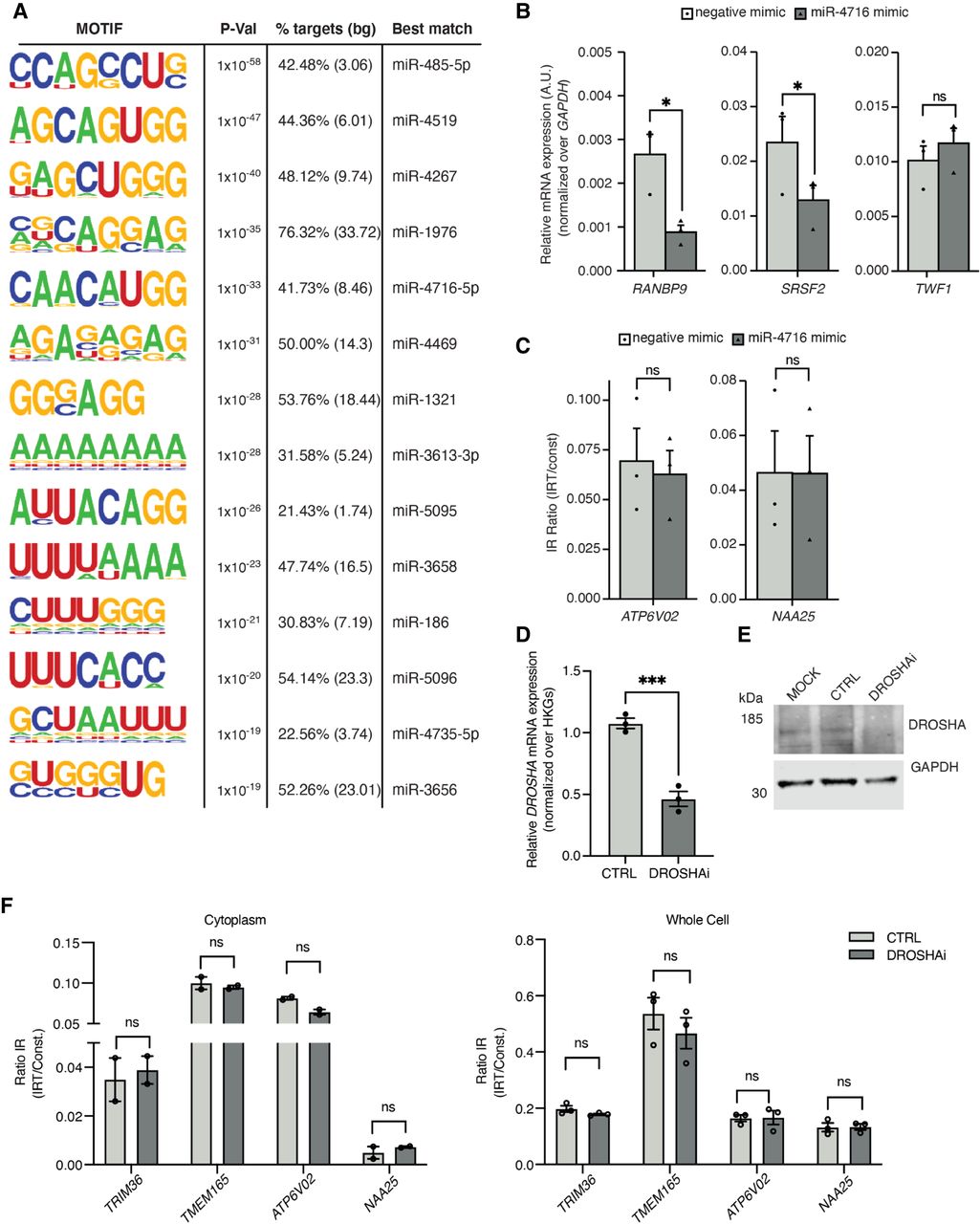 Functional investigation of the miRNA seed enrichments in the C5 group of intronic sequences. (A) Fourteen motifs enriched in the 270 retained introns of the C5 category identified by HOMER (Heinz et al. 2010). (B) Relative mRNA expression of RANBP9 and SRSF2 (predicted targets of miR-4716-5p) and TWF1 mRNA in HeLa cells transfected with mimics for miR-4716-5p (miR-4716 mimic) or a scrambled negative control (negative mimic). Values are normalized over GAPDH. Data are presented as mean ± SEM. t-test: (*) P < 0.05. Data points represent independent experimental repeats (n = 3). (C) Analysis of IR of C5 candidates ATP6V02 and NAA25 in HeLa cells transfected with mimics for miR-4716-5p or a scrambled negative control. Values are calculated as levels of IRT over total transcript expression for each candidate. Data are presented as mean ± SEM. t-test: (*) P < 0.05. Data points represent independent experimental repeats (n = 3). (D) Bar graphs showing qPCR analysis of DROSHA relative mRNA expression levels in MNs (DIV = 21) after being transfected with siRNA targeting DROSHA (DROSHAi) or a scrambled control (CTRL). Values are normalized over the geometric mean of housekeeping genes (GAPDH, POLR2B, UBE2D3) and expressed as fold change over mock transfected cells. Data are presented as mean ± SEM. Data are derived from three individual cell lines, one experimental block. Paired t-test: (***) P < 0.0005. (E) SDS-PAGE/western blotting showing expression levels of DROSHA and GAPDH in MNs (DIV = 21) transfected with siRNA targeting DROSHA, a scrambled control, or mock transfected cells (MOCK). GAPDH is assayed as a loading control. (F) Bar graphs showing qPCR analysis of candidate C5 IR levels in cytoplasmic (left) and whole-cell (right) MN (DIV = 21) samples upon DROSHA knockdown. IR ratio values are calculated as levels of IRT over total transcript expression for each candidate. Data are presented as mean ± SEM. Data are derived from three individual cell lines (whole cell) and two individual cell lines (cytoplasmic), one experimental block. Multiple paired t-tests with significance placed at <0.05. (ns) not significant.