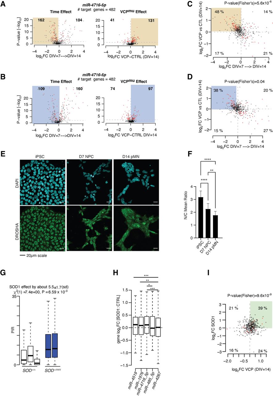 ALS-related transient accumulation in cytoplasmic retained introns correlates with reduced miRNA activity. (A) Volcano plots representing the effect size (i.e., log2(fold-change) on the x-axis) against the statistical significance (i.e., −log10(P-value) on the y-axis) of the changes in the nucleus in gene expression between two consecutive time points from DIV = 7 to DIV = 14 for control cell lines (left) and between control and VCP mutant cell lines at DIV = 14 time point (right) for the TargetScan predicted target genes of miR-4716-5p. (B) Same as A but for cytoplasmic gene expression changes. (C) Scatter plots showing the relationships of the expression changes between DIV = 7 and DIV = 14 in nuclear control samples (x-axis; log2FC) and between control and VCPmu cell lines at DIV = 14 (y-axis; log2FC) of the predicted target genes for miR-4716-5p. Red color indicates genes with P-value < 0.01 in both comparisons. P-value obtained from one-side Fisher's exact test comparing the number of genes showing log2FC(DIV = 7 → DIV = 14) < 0 and log2FC(VCP vs. CTRL at DIV = 14) in the pool of miRNA predicted targets with those from the total set of genes. (D) Same as C but for cytoplasm. (E) Representative images of DROSHA (green) and DAPI (blue) in iPSC, NPC (DIV = 7), and pMN (DIV = 14) time points of control cells. (F) Nuclear-to-cytoplasmic ratio of mean DROSHA intensity is plotted for iPSC, NPC (DIV = 7), and pMN (DIV = 14) cell stages. Two-way ANOVA: (ns) nonsignificant, (*) P < 0.05, (**) P < 0.01, (***) P < 0.001, (****) P < 0.0001. Data are derived from n = 5 cell lines, one experimental repeat. (G) Boxplots displaying the distribution of PIR for the 270 introns of the C5 category in control MN (white box) and SOD1mu MN samples (blue bar; left) (Kiskinis et al. 2014). SOD1mu samples show a systematically higher proportion of IR compared with controls. Linear mixed effects analysis of the relationship between the PIR for the 270 introns and SOD1 mutation was used to account for idiosyncratic variation owing to patient differences. (H) Distributions of the changes in expression between SOD1mu and control samples for the predicted target genes of miR-4519, miR-1976, miR-4716-5p, miR-485-5p, and miR-4267. (I) Scatter plot showing the relationships of the expression changes between DIV = 14 VCPmu (x-axis; log2FC) and SOD1mu (y-axis; log2FC) samples of the predicted target genes for miR-4716-5p. Red color indicates genes with P-value < 0.01 in both comparisons. P-value obtained from one-side Fisher's exact test comparing the number of genes showing log2FC(SOD1 vs. CTRL) > 0 and log2FC(VCP vs. CTRL at DIV = 14) > 0 in the pool of miRNA predicted targets with those from the total set of genes. (G,H) Data shown as box plots in which the center line is the median; limits are the interquartile range; and whiskers are the minimum and maximum.