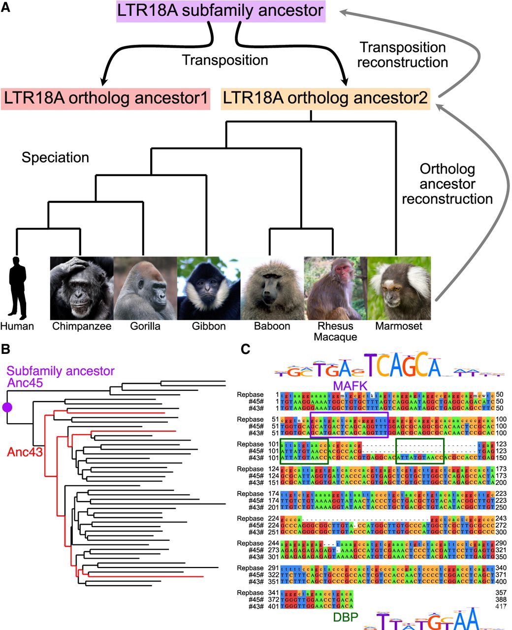 LTR18A ancestral reconstruction. (A) Model of LTR18A evolution split into transposition and speciation phases. Computational reconstruction was performed for ortholog ancestors and transposition intermediates using PRANK. (B) Phylogenetic tree for reconstructed transposition intermediates and ortholog ancestors at leaves. Ancestral node 43 (Anc43) is labeled in red, as well as the edges to ortholog ancestors that contain the 27-bp insert. The subfamily ancestor at ancestral node 45 (Anc45) is labeled by the purple dot. (C) Alignment of Repbase consensus (top), Anc45 (#45#, middle), and Anc43 (#43#, bottom). Motifs in the sequences are boxed. DBP is shown to represent CEBP-related motifs.