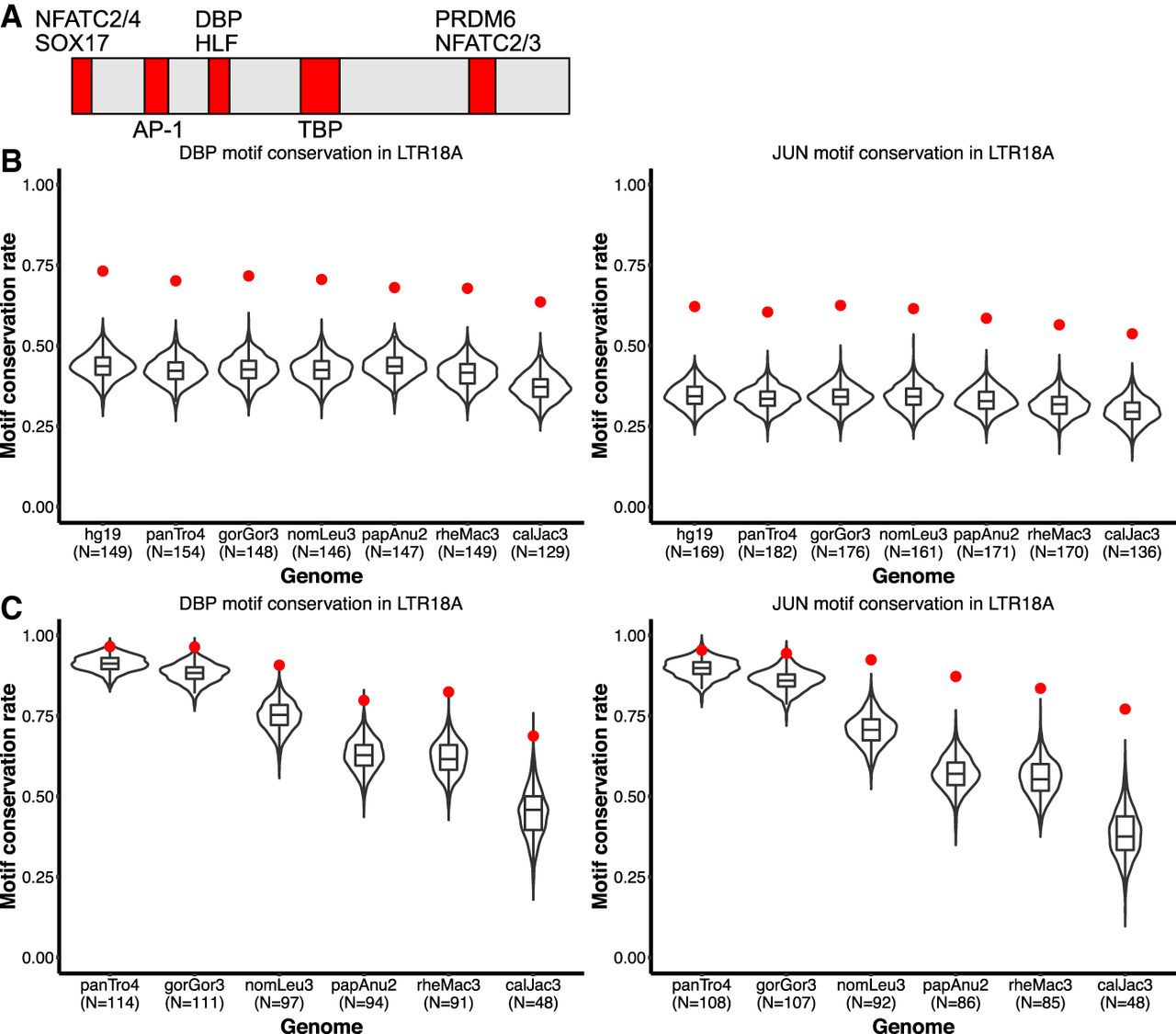DBP and JUN motifs are more conserved than expected. (A) Motifs that are fully encompassed within shared, conserved 10-bp sliding windows across seven primate species. Motif locations in red are relative to the LTR18A Repbase consensus sequence. (B) Distribution of expected neutral DBP and JUN motif conservation rates from the consensus motif across primate species. One thousand simulations are displayed for each species. The observed conservation rate is shown by the red point. (C) Same as B, but for conservation rates from the hg19 ortholog as reference.