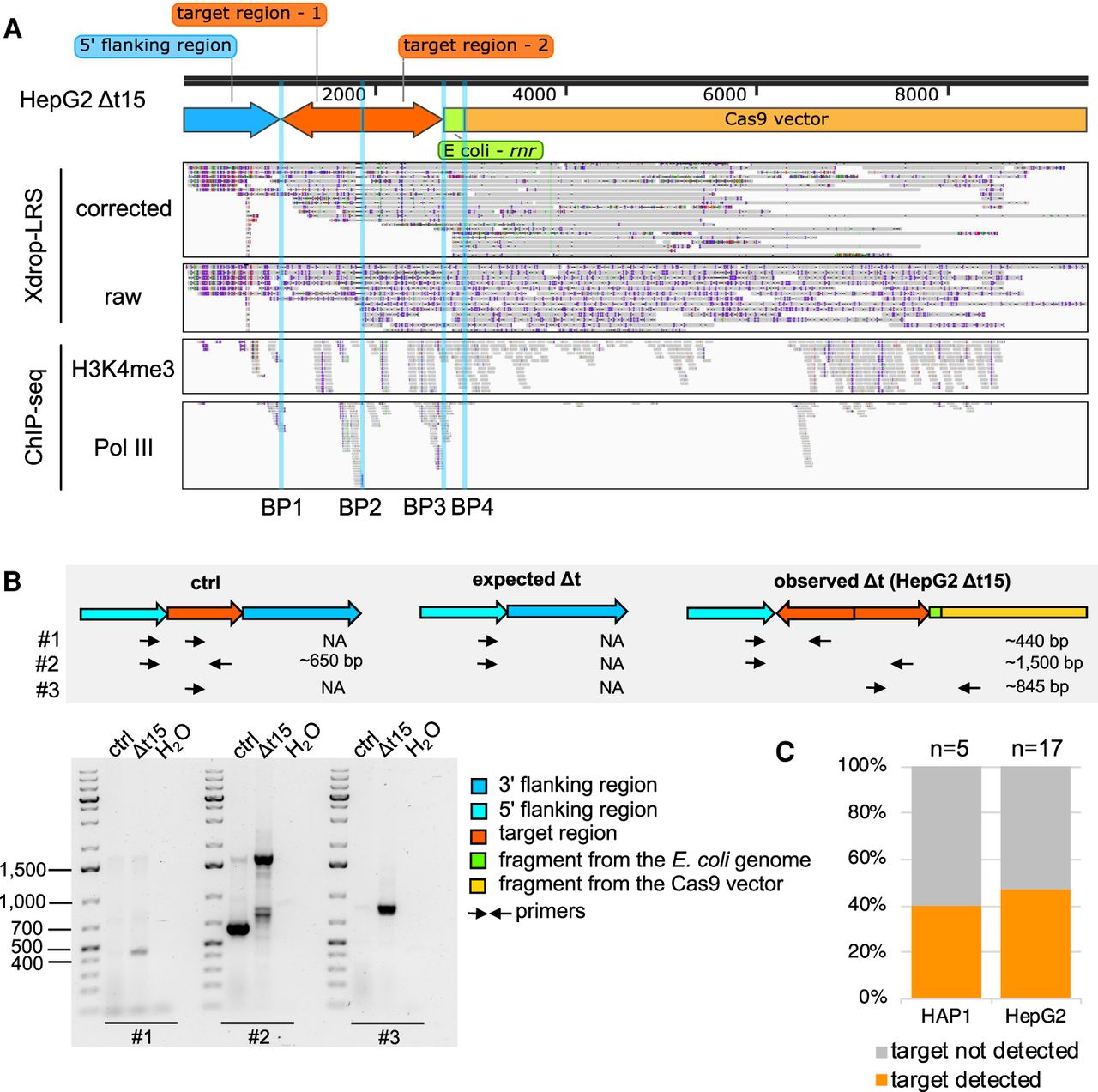 A duplication, inversion of target-derived fragments, and integration of exogenous DNA fragments arose in the deletion clone HepG2 Δt15. (A) The genome browser view shows Xdrop-LRS (top, corrected and raw reads) and ChIP-seq (bottom, histone H3 lysine 4 trimethylation [H3K4me3] and RNA polymerase III [Pol III] reads) aligned against the assembled contig supporting four different breakpoints (BP1-4, blue vertical lines) within the contig. Arrows (top) show genomic orientation and approximate size of the flanking (blue) and target (orange) regions, as well as sequences of the E. coli genome (green) and the CRISPR-Cas9-gRNA-Δt-1 transfection vector (yellow) present within the contig. (B) Schematic illustration of the strategy to validate the contig and the expected PCR product length (top) of alleles with an unmodified control (ctrl), expected and observed editing event in deletion clone HepG2 Δt15. Alleles with the expected deletion and on-target alterations exist in deletion clone HepG2 Δt15. Agarose gel image (bottom) visualizes the size of the PCR products. Marker bands specify DNA size in bp. (C) Stacked bar plot indicates the frequency of on-target genomic alterations in the validated HAP1 (n = 5) and HepG2 (n = 17) Δt deletion clones.