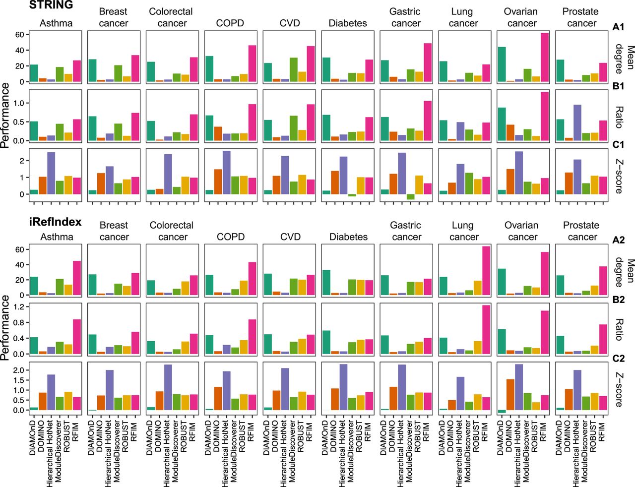 Connectivity comparison of the disease modules obtained by different methods and different phenotypes. We applied each disease module detection method in the genome-wide association studies (GWAS) of each disease separately and compared (A) the mean degree of genes in the disease module; (B) the ratio between the average degree of the disease module and that of the nodes that directly interact with the disease module nodes; (C) and statistical significance of the size of the disease module's largest connected component (LCC), with respect to LCCs of randomly sampled proteins of the same size as the disease module. Z-score is calculated from 1000 degree preserving randomizations.