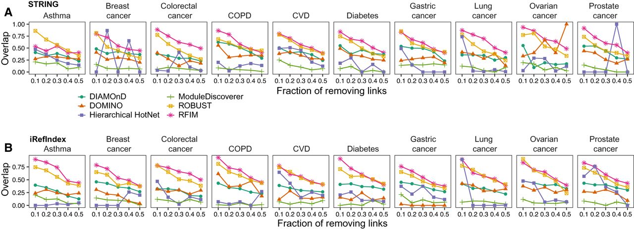 Sensitivity of disease module detection to the interactome. For each interactome, STRING (A) or iRefIndex (B), we first applied each disease module into the original interactome. Then, a fraction of protein–protein interactions (PPIs) randomly selected from the original interactome were removed. Finally, we performed the disease module detection algorithms again using perturbed interactome and compared the fraction of overlapping genes in the union genes of the disease module identified from the original and perturbed interactome, respectively.