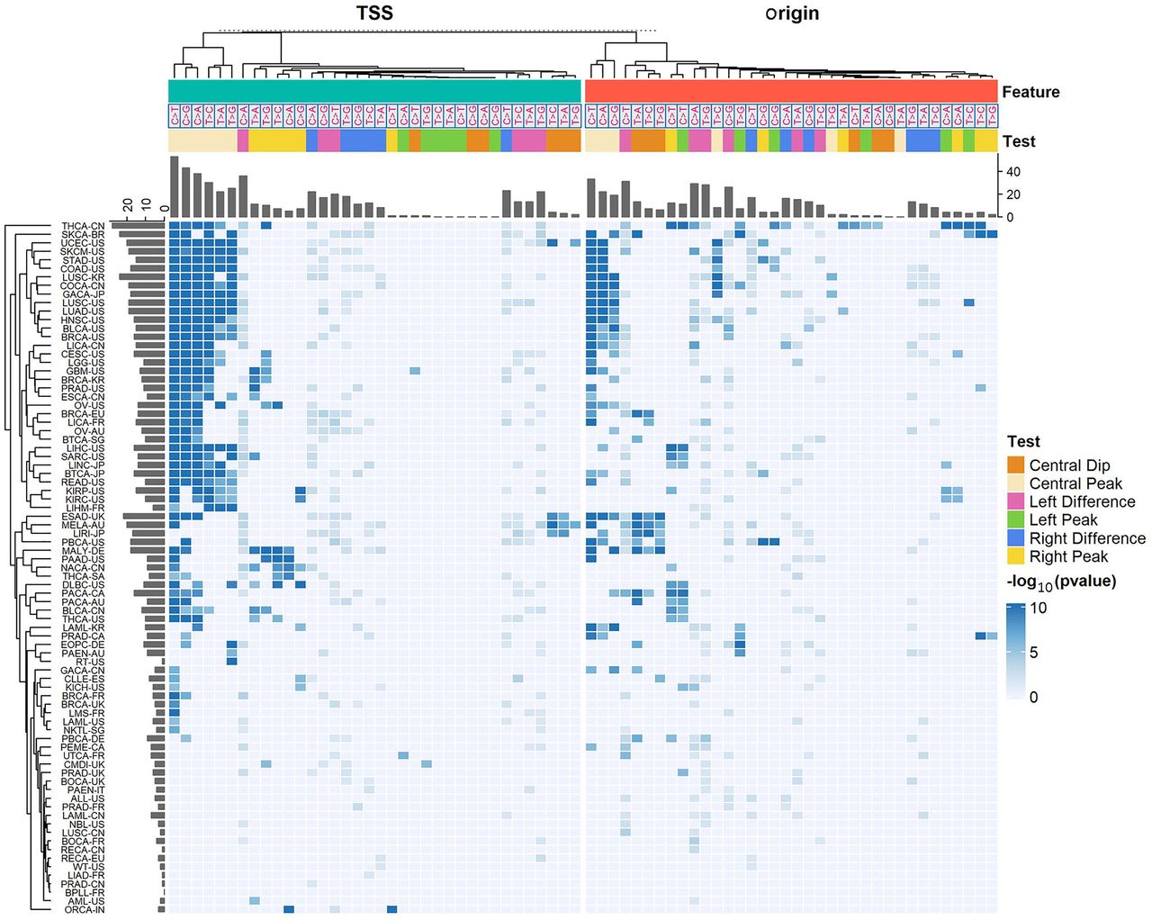 Overview of MutDens bulk analyses across all ICGC cohorts and all six mutational classes. Rows designate 81 ICGC cancer cohorts, and columns designate a total of 72 tests within each cancer cohort, concerning TSS and replication origin. The 72 tests per cohort differed by focal genomic feature (Feature), mutational class, and specific test objective (Test). Intensity in the heatmap is proportional to the inverse P-value (−log10(P)). All insignificant P-values (P > 0.01 for density difference tests and P > 1 × 10−5 for peak/dip tests) were treated as P = 1 and hence shown in the dimmest color.