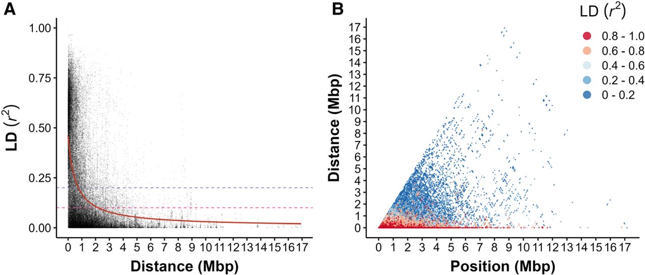 Within-scaffold linkage disequilibrium (LD) decays slowly in WRC. (A) LD was assessed using SNPs with a minor allele frequency (MAF) cutoff of 0.05 to reduce error associated with rare alleles (n = 16,202 SNPs). Decay was estimated using a nonlinear model (red line); r2 decayed to baseline thresholds of 0.2 (purple dotted line) and 0.1 (pink dotted line) at 0.751 and 2.17 Mbp, respectively. (B) Pairwise LD for all pairs of SNPs (n = 16,202). Each point on the plot represents the LD between two SNPs at a given distance from one another and relative position on the scaffold. Color indicates LD range, with red indicating SNPs in strong LD.