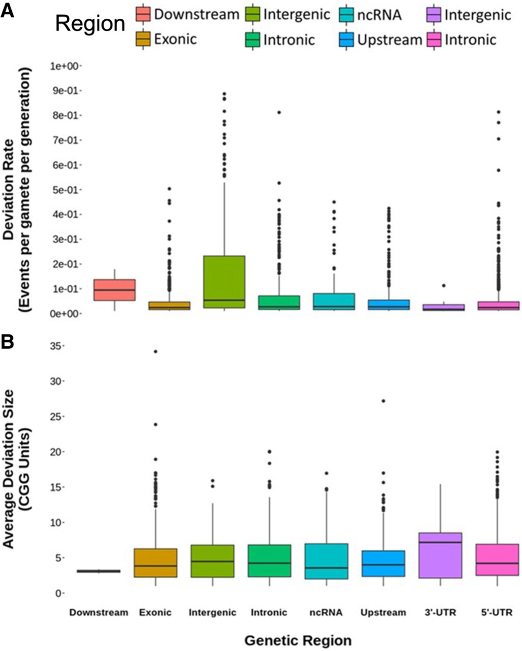 A comparison of CGG short tandem repeat characteristics between the specified genetic regions. (A) Distribution of repeat deviation rate of all unusually mutable CGG STR loci within the different genetic regions and (B) distribution of the mean deviation size for each CGG repeat per given genetic region. (A) Intergenic regions display, by far, the largest rate of CGG repeat variation than any given region. (B) Despite differences in the rate of deviation, on average, CGG repeats show comparable behaviors at the level of genetic regions. The one difference can be seen in the downstream region. Note that outliers have been removed from the display in order to improve figure resolution.