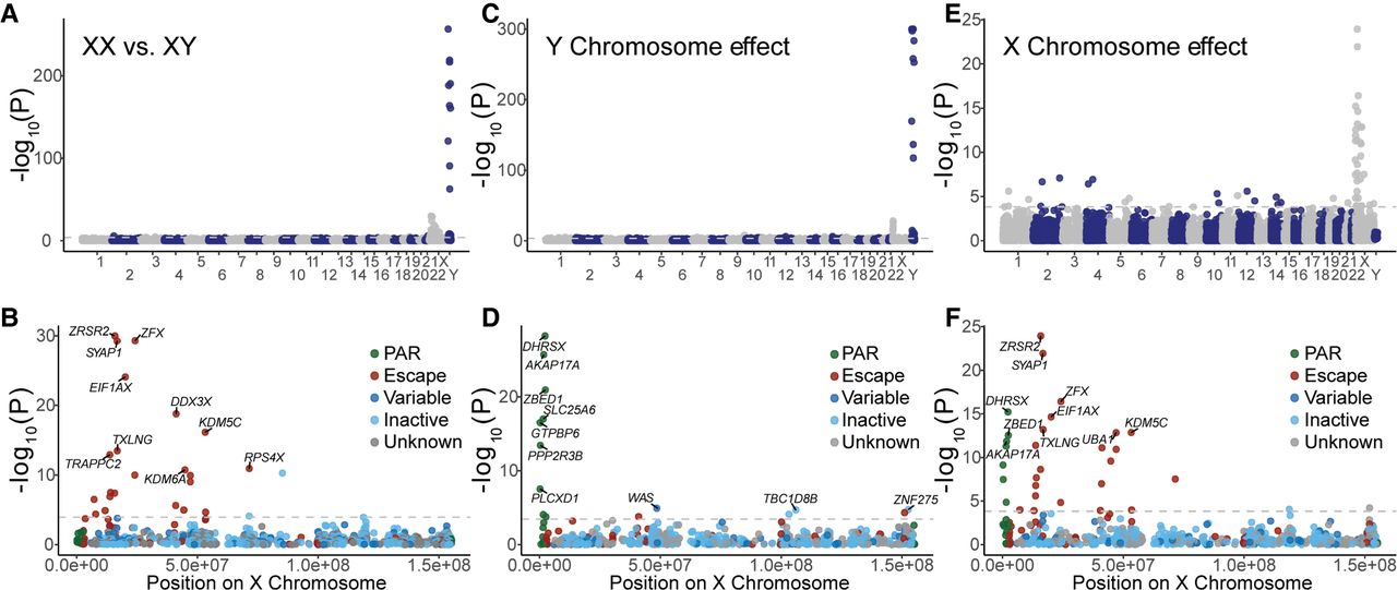 Gene expression is influenced by sex chromosomes. Manhattan plots of the differential expression analysis, showing the −log10 of the P-values as a function of the chromosomal positions of genes. Results are shown for three tests: (A,B) differences between female XX and male XY cell lines, (C,D) association with the presence of the Y Chromosome, and (E,F) association with the number of X Chromosomes. The dashed line denotes a threshold of FDR = 0.05. The upper plots (A,C,E) show the results of genome-wide expression analysis, and the lower plots (B,D,F) show the results for the X Chromosome. The different colors indicate genes on the PARs and the X-inactivation status for the rest of the genes. The names of the 10 most significant genes are shown.