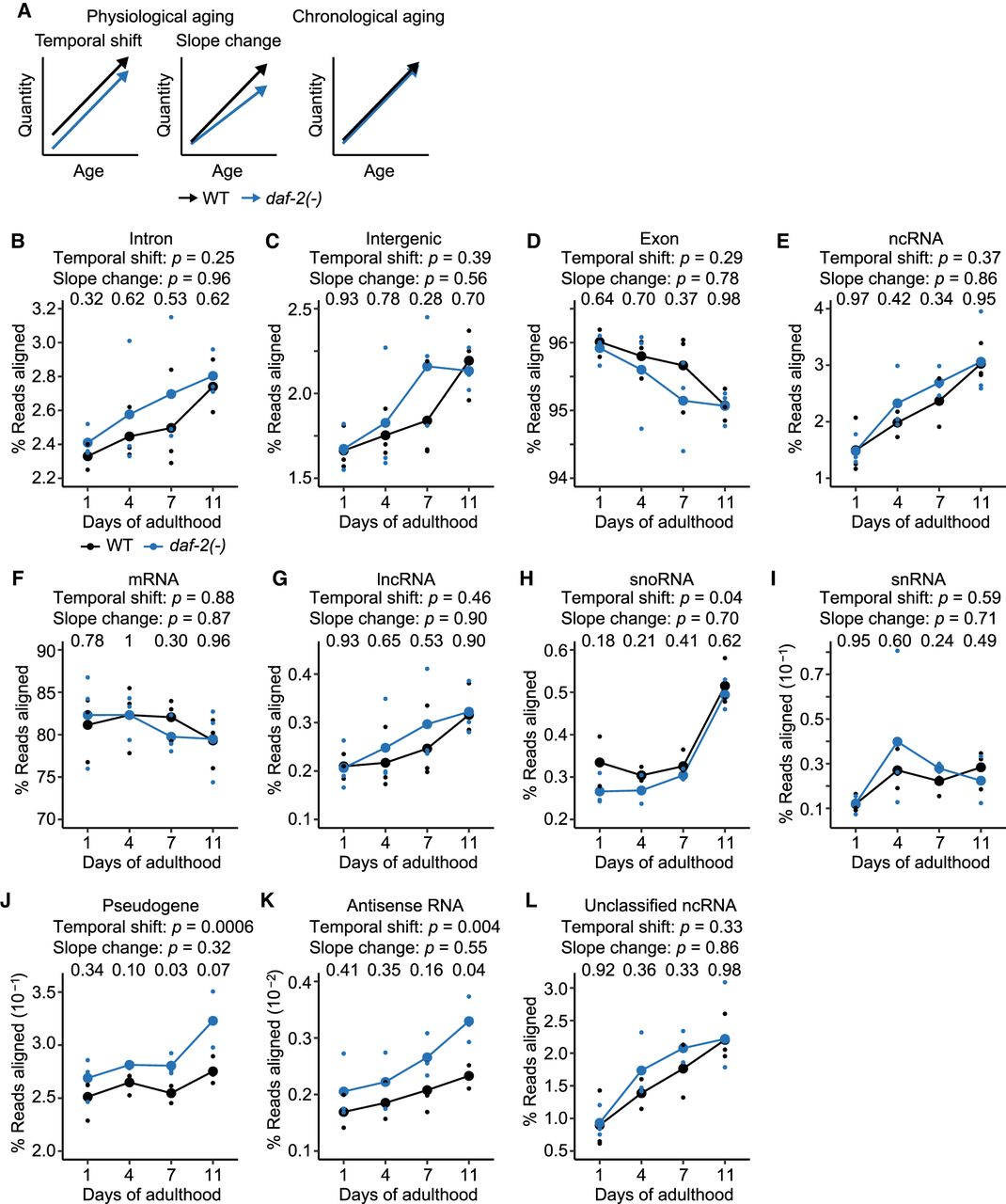 daf-2 mutations affect age-dependent changes in transcriptional fidelity. (A) Schematic of transcriptomic features that match physiological and chronological aging in wild-type (WT) and daf-2(e1370) [daf-2(-)] animals. The transcriptomic features associated with physiological aging were categorized as temporal shift that begins at early adulthood and slope change that alters aging rates throughout adulthood. (B–D) Overall expression levels of structural elements, including intron (B), intergenic (C), and exon regions (D) in WT and daf-2(-) animals at different ages. (E,F) Overall expression levels of functional elements, including noncoding RNA (ncRNA) (E) and protein-coding messenger RNA (mRNA) (F) in WT and daf-2(-) animals at indicated ages. (G–L) Age-dependent level changes in ncRNA, including long ncRNA (lncRNA) (G), small nucleolar RNA (snoRNA) (H), small nuclear RNA (snRNA) (I), pseudogene-coded RNA (pseudogene) (J), antisense RNA (K), and unclassified ncRNA (L) in WT and daf-2(-) animals. Overall snoRNA levels increased with age and shifted down in daf-2(-) animals compared with those in WT animals at day 1 of adulthood (H). The levels of pseudogene-coded RNAs (J) and antisense RNAs (K) increased with age and shifted up in daf-2(-) animals at day 1 of adulthood (Supplemental Fig. S5D,E). P value is shown at each day, calculated by two-tailed Welch's t-test between WT and daf-2(-) animals of the same chronological age. In each panel, two P values are shown for the effects of genotypes on transcript levels that correspond to “Temporal shift,” and those for interaction between genotypes and ages that correspond to “Slope change,” calculated by using two-way analysis of variance (ANOVA). Note that results from WT animals are the same as those used in Figure 1B–L; they are shown here for the comparison with daf-2(-) animals.