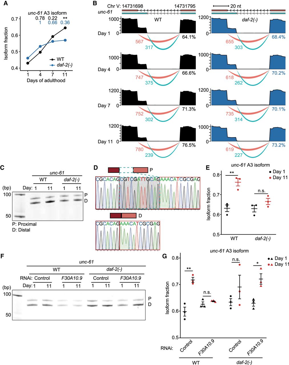 daf-2 mutations slow age-dependent increases in the usage of distal 3′ splice sites in unc-61. (A) Changes in isoform fraction of unc-61 A3 isoforms during aging in wild-type (WT) and daf-2(e1370) [daf-2(-)] animals. Adjusted P values are shown on top of the data points, calculated relative to day 1 of adulthood data using IsoformSwitchAnalyzeR; (**) adjusted P < 0.01. (B) Aligned reads (top) and junction usage (bottom) of unc-61 (Chr V: 14,731,698–14,731,795) A3 isoforms in WT and daf-2(-) animals at indicated ages. Pink lines represent junctions with distal 3′ splice sites, whereas cyan lines represent those with proximal 3′ splicing sites. Numbers below the lines indicate the numbers of reads aligned at the junctions. Percent numbers represent the ratios of reads at junctions with distal 3′ splicing sites to total reads at junctions with proximal and distal 3′ splicing sites. (C) RT-PCR analysis of the proximal (P) and distal (D) splice sites of unc-61 isoforms at days 1 and 11 of adulthoods. (D) Sequences and electropherograms of the RT-PCR amplicons of unc-61 isoforms. (E) Isoform fraction of unc-61 A3 isoforms that were obtained from three independent RT-PCR experiments. Error bars represent standard error of the mean (SEM). P values were calculated by two-tailed Student's t-test relative to day 1 of adulthood data; (**) P < 0.01, n.s.: not significant. (F) RT-PCR analysis of the P and D splice sites of unc-61 isoforms at days 1 and 11 of adulthoods in control RNAi- and F30A10.9 RNAi-treated animals. (G) Isoform fraction of unc-61 A3 isoforms that were obtained from three independent RT-PCR experiments. Error bars represent standard error of the mean (SEM). P values were calculated by two-tailed Student's t-test relative to day 1 of adulthood data; (*) P < 0.05, (**) P < 0.01, and n.s.: not significant. See Supplemental Source files for statistical analysis of the RT-PCR data shown in this figure and Supplemental Table S4 for primer sequences used in this RT-PCR.