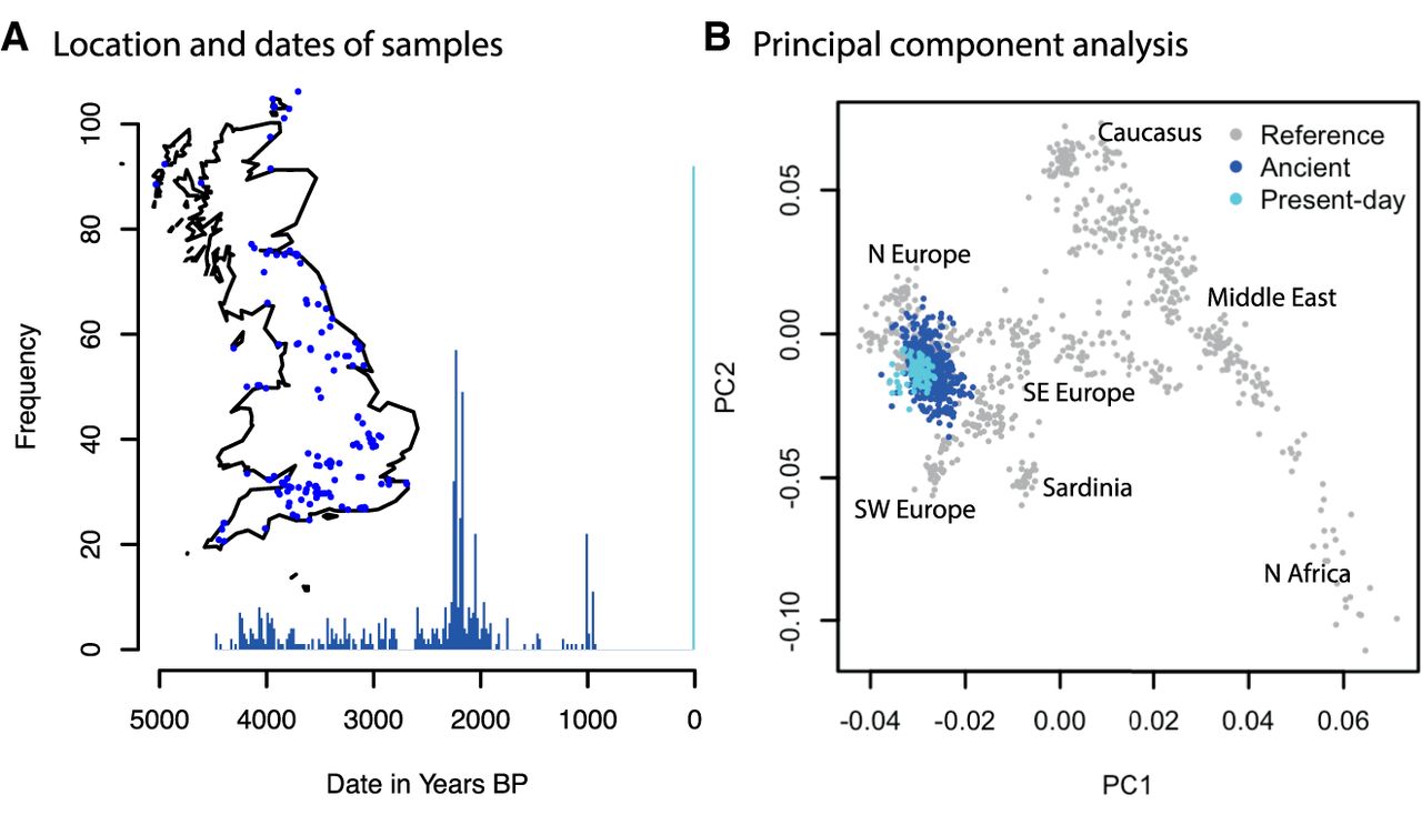 Ancient British data. (A) Histogram of dates of ancient individuals. Inset map shows locations of sites. (B) Principal components of ancient and present-day samples projected onto axes defined by 777 West Eurasian individuals (for details of these individuals, see Lazaridis et al. 2014).
