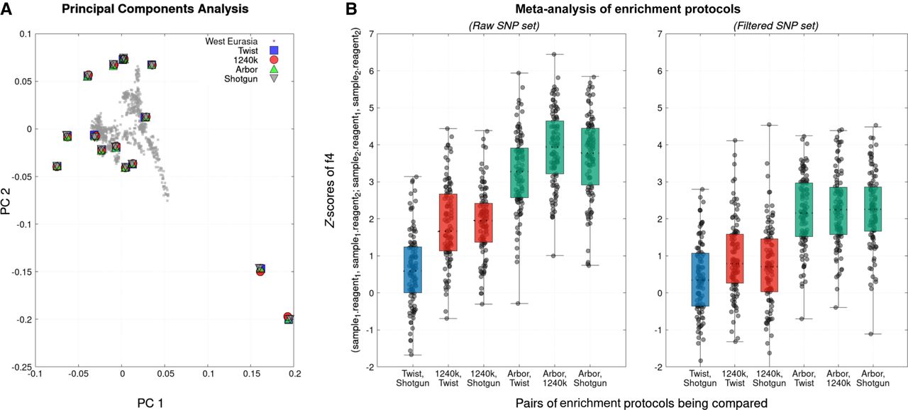 Population genetic effects of enrichment and an effective filter for reducing bias. (A) Projection of data from 15 libraries in the last rows of Table 1 onto a PCA of modern West Eurasians (gray squares) shows nearly identical positions regardless of data source. (B) We compute symmetry statistics of the form f4(library 1 − reagent 1, library 1 − reagent 2; library 2 − reagent 1, library 2 − reagent 2) and plot Z-scores for all 105 = 15 × 14/2 pairwise comparisons of the libraries (box-and-whisker plots show range, 25th and 75th percentiles, and mean). The statistics involving Arbor Complete are shown in green; remaining comparisons involving 1240k are shown in red; and the Twist–shotgun comparison is in blue. We show results both for all SNPs targets (left) and after applying the bias filter retaining a subset of 42% of autosomal SNPs (right). Results for this figure reflect data after removal of duplicated sequences.