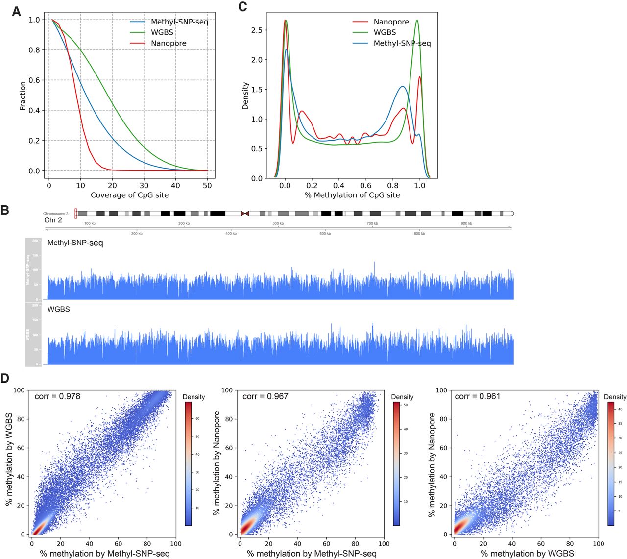 Methylome. (A) Distribution of coverage on CpG sites for Methyl-SNP-seq (blue), whole-genome bisulfite sequencing (WGBS) (green), and Nanopore (red). (B) Read coverage on part of the human Chr 2 for Methyl-SNP-seq (top) and WGBS (bottom). (C) Distribution (kde plot) of % methylation on CpG sites having coverage ≥ 5. (D) Pairwise comparison of the methylation level of CpG islands measured by Methyl-SNP-seq, whole-genome bisulfite sequencing from ENCODE (WGBS), and Nanopore sequencing. Each dot represents the percentage methylation at CpG island. Only CpG islands having coverage ≥ 50 were used for correlation calculation. A total of 27,050; 27,313; and 16,071 CpG islands were detected by Methyl-SNP-seq, WGBS, and Nanopore sequencing, respectively.