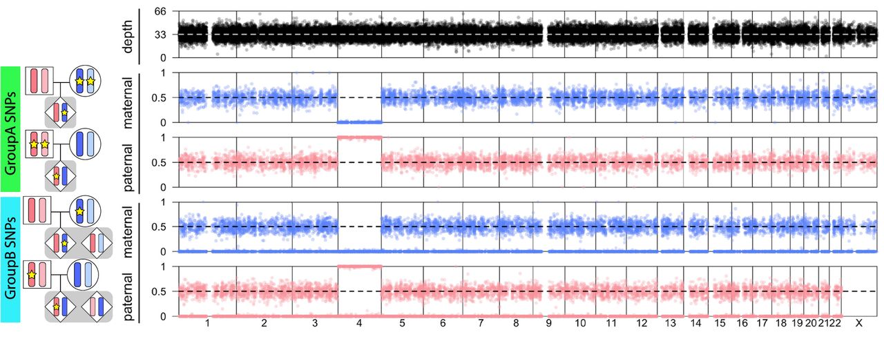 Detection of uniparental disomy (UPD). Variant allele frequencies (VAFs) of each variant type in the offspring, based on the parent of origin and parental genotype combinations (GroupA and GroupB), are shown with the total depth plot on the genomic coordinate. Whole-chromosome level UPD was identified with TrioMix, revealing a paternal isodisomy pattern. The gray dashed line on the depth plot represents the mean autosomal depth. The black dashed lines on the VAF plots represent VAF = 0.5.