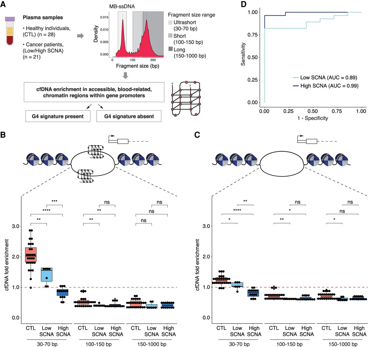 Assessment of cfDNA enrichment in accessible blood-related chromatin regions within gene promoters that contain or lack a G4 signature in MB-ssDNA libraries. (A) Schematics of the assessment of plasma cfDNA fold enrichment in genomic regions associated with predicted quadruplex sequences (PQS) that have been previously observed to adopt G4 structures (observed quadruplex sequences [OQS]), denoted as PQS/OQS regions. (B,C) Fold enrichment of cfDNA fragments in accessible blood-related chromatin regions within gene promoters that contain (B) or lack (C) a G4 signature at different fragment sizes (30–70, 100–150, 150–1000 bp) in samples from healthy individuals and cancer patients. The red dashed line indicates no enrichment relative to random permutation. (D) ROC curve analysis of US cfDNA fold enrichment in accessible blood-related chromatin regions within gene promoters that contain a G4 signature, for discriminating cancer patients from the healthy individuals using MB-ssDNA protocol. Wilcoxon rank-sum test: (*) P < 0.05; (**) P < 0.01; (***) P < 0.001; (****) P < 0.0001; (ns) nonsignificant.