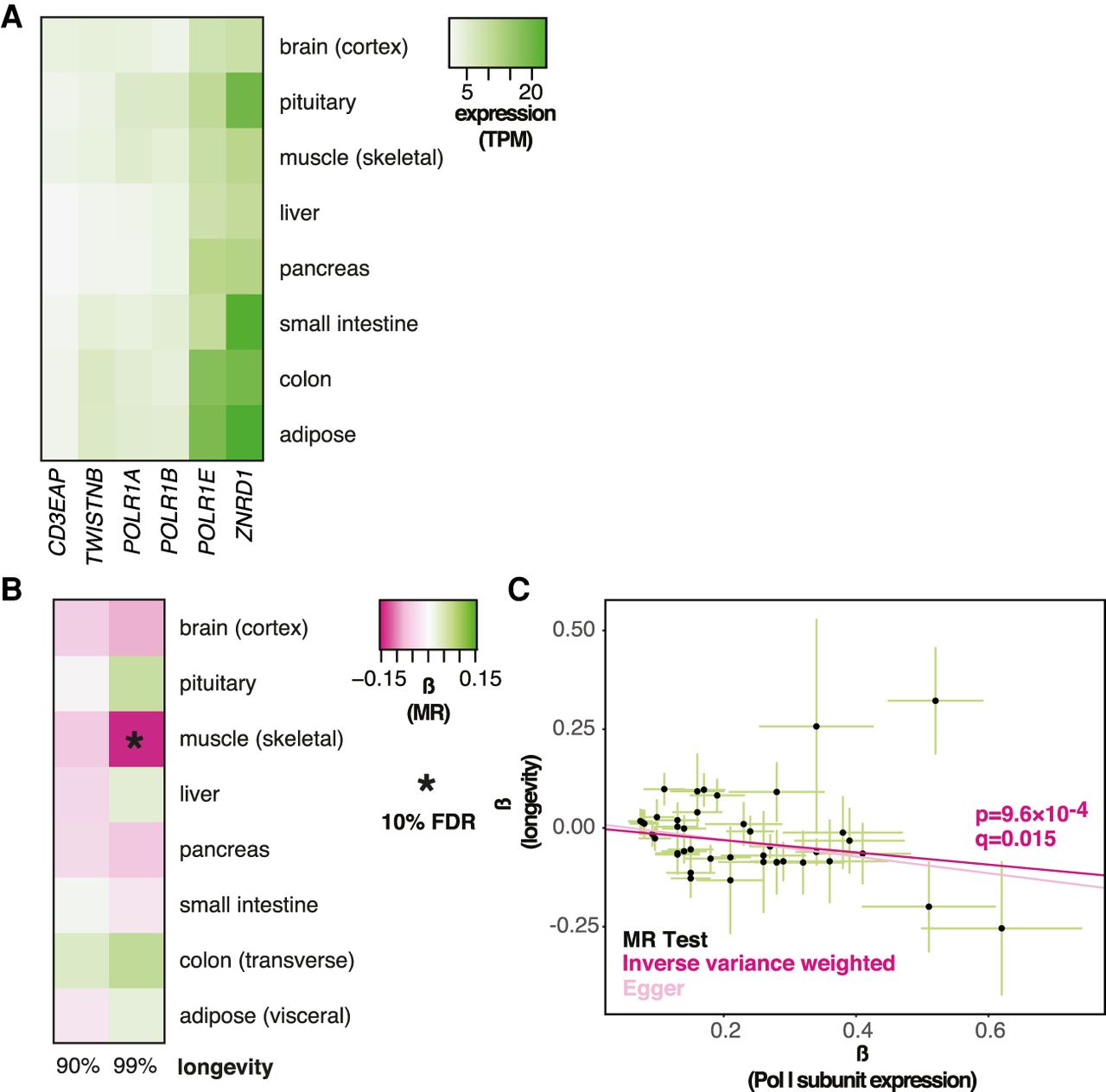 MR analysis of association between expression of Pol I–specific subunits and longevity. (A) Levels of mRNA coding for Pol I–specific subunits in the indicated tissues are shown. (B) MR analysis was performed using Pol I–specific subunit expression in the indicated tissues as exposures and longevity (survival beyond the 90th or 99th percentile) as outcomes. The values of β are given per tissue and the significant associations indicated as those that pass the 10% FDR threshold (accounting for eight tissues and two outcomes, i.e., 16 tests). (C) MR scatter plot of association between Pol I expression in skeletal muscle and longevity (99th percentile), showing results of two MR methods. Each black point denotes a cis-eQTL; green bars show SEM. Longevity β is the natural log of the odds ratio, where lower values indicate a lower chance of surviving beyond the 99th percentile. Expression β is reported as NESs, with larger values indicating higher expression, and refers to expression of multiple genes.