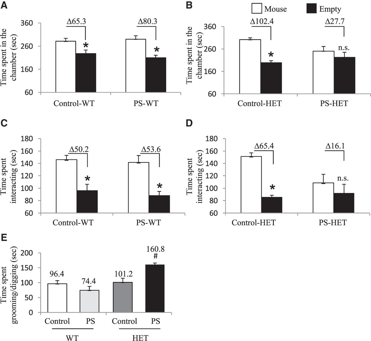 Results from social behavioral tests in female offspring. (A–D) Three-chamber social interaction test: (A,B) time spent in the chamber with either an unfamiliar mouse inside a cup (mouse) or with an empty cup (empty). Data analysis details: (A) two-way ANOVA for control-WT versus PS-WT groups—effect of time spent in either chamber, F(1,42) = 28.5, P-value < 0.001; and (B) two-way ANOVA for control-HET versus PS-HET groups—effect of time spent in either chamber, F(1,32) = 16.2, P-value < 0.001, and interaction between time spent in either chamber and treatment, F(1,32) = 5.3, P-value = 0.002. (C,D) Time spent interacting with either an unfamiliar mouse inside a cup (mouse) or with an empty cup (empty). Data analysis details: (C) two-way ANOVA for control-WT versus PS-WT groups—effect of time spent interacting, F(1,42) = 29, P-value < 0.001; and (D) two-way ANOVA for control-HET versus PS-HET groups—effect of time spent interacting in either chamber, F(1,32) = 9.9, P-value = 0.003. All asterisks denote P-value ≤ 0.05, two-way ANOVA with Bonferroni multiple comparison test–determined post hoc significance. Δ denotes the difference in time spent. (E) Ten-minute reciprocal social interaction test in female offspring. One-way ANOVA detected effect of groups on time spent grooming/digging during a 10-min reciprocal social interaction test (F(3,16) = 10.9, P-value < 0.001). Hashtag (#) denotes significance for time spent grooming/digging between PS-HET in comparison to Control-WT, Control-HET, and PS-WT (P-value < 0.05). N = 9–10 per treatment for each genotype.