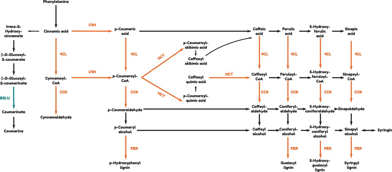 Genes in the phenylpropanoid pathway with consistent ASE for SRA5 and KQ228. Enzymes in orange correspond to genes with consistent ASE in the internodes of SRA5 but not in KQ228. The metabolic step in blue indicates different genes with consistent ASE in either genotype. (BGLU) β-Glucosidase; (C4H) trans-cinnamate 4-monooxygenase; (4CL) 4-coumarate-CoA ligase; (HCT) shikimate O-hydroxycinnamoyltransferase; (CCR) cinnamoyl-CoA reductase; (PER) peroxidase.