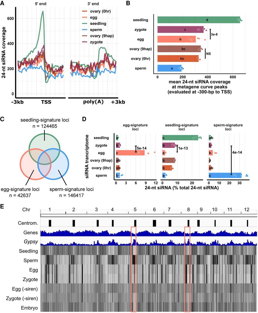Changes in the zygote siRNA transcriptome after fertilization are independent from the ovary. (A) Metagene coverage plot for 24-nt siRNAs. Coverage is measured over 100-bp intervals and normalized per 1000 24-nt siRNAs. Vertical grid lines are 500-bp intervals. TSS transcription start site, poly(A) polyadenylation site. (B) Quantification of A at the interval from 300 to 200 bp upstream of TSS, corresponding to the peaks of metagene curves. Each data point is an siRNA transcriptome and bar heights are averages. x-axis values are normalized per 1000 24-nt siRNAs. (C) Venn diagram illustrating egg-signature loci (egg siRNA loci that do not overlap any seedling or sperm siRNA loci), seedling-signature loci (seedling siRNA loci that do not overlap any egg or sperm siRNA loci), and sperm-signature loci (sperm siRNA loci that do not overlap any egg or seedling siRNA loci). Sizes of overlap in Venn diagrams are not to scale. (D) Bar plot showing relative abundances of 24-nt siRNA across siRNA loci categories defined in C. The zygote siRNA transcriptome was not used to define these locus categories. Each data point is an siRNA transcriptome. Bar heights are averages. x-axis values are normalized to total 24-nt siRNAs. (E) Heat map showing abundance of 24-nt siRNA across the genome at 50-kb resolution. The first three tracks are centromeres (as defined by Mizuno et al. 2018), genes, and Gypsy retrotransposons. “−siren” refers to siren siRNAs removed. Pink boxes highlight examples of centromeric regions. Letter grouping (α = 0.05) and P-values are based on Tukey tests. Zygote and 9-hap ovary data are from this study; embryo (7–8 DAF) from Rodrigues et al. (2013); all other data from Li et al. (2020).