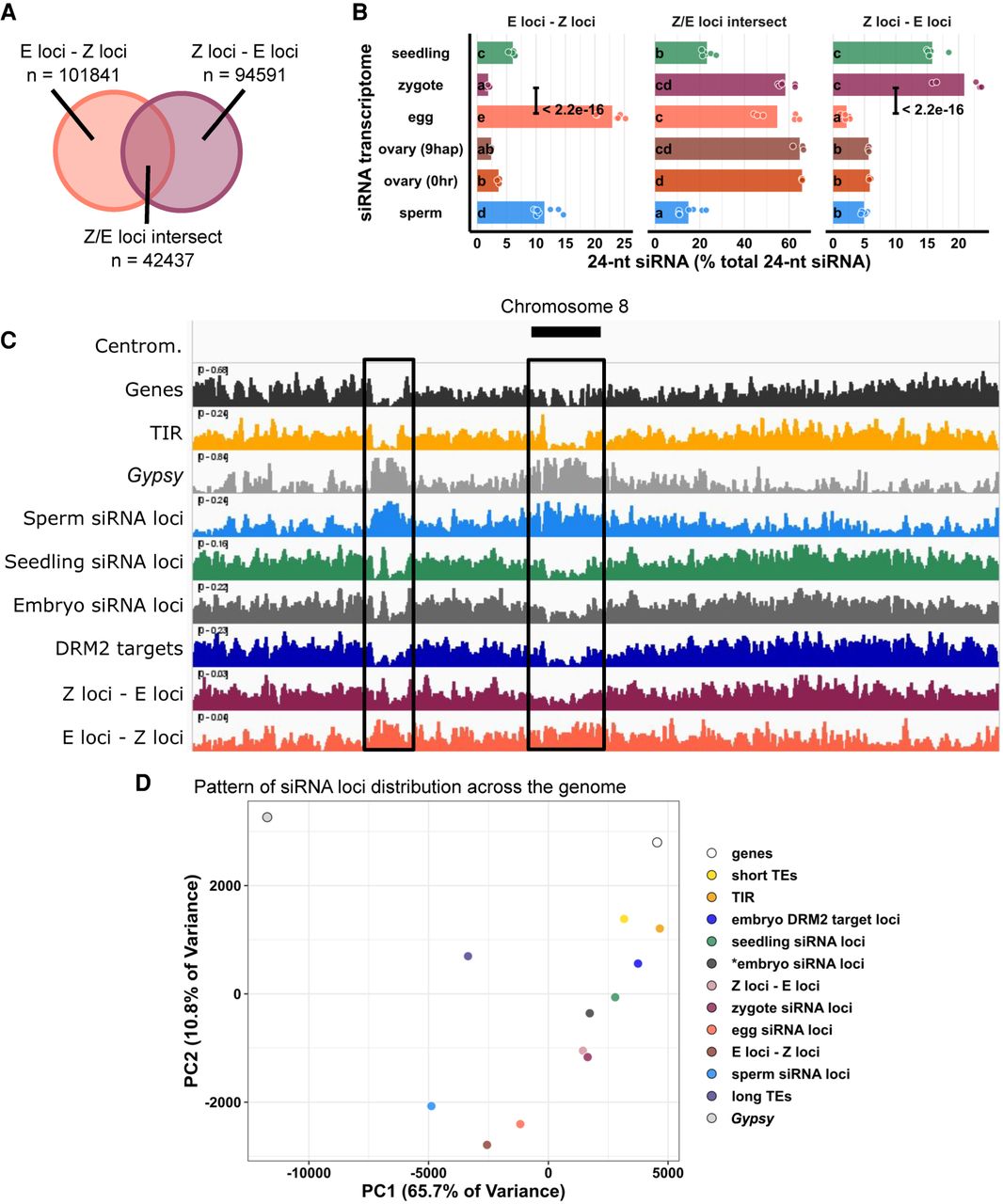 Widespread distribution of newly detected zygote siRNA loci across the rice genome. (A) Venn diagram illustrating E-Z loci (egg siRNA loci that do not overlap any zygote siRNA loci, E loci ∉ Z loci), Z-E loci (zygote siRNA loci that do not overlap any egg siRNA loci, Z loci ∉ E loci), and Z/E loci intersect (zygote siRNA loci that overlap egg siRNA loci, Z loci ∩ E loci). Sizes of overlap in Venn diagrams are not to scale. (B) Quantification of 24-nt siRNA relative abundances for A. Each data point is an siRNA transcriptome. Bar heights are averages. x-axis values are relative to total 24-nt siRNA reads. Letter grouping (α = 0.05) and P-values are based on Tukey tests. (C) Distribution of siRNA loci along a chromosome. Chromosome 8 is chosen because it is one of the chromosomes with a completed sequenced centromeric region (Mizuno et al. 2018). (Centrom) Centromeric regions, black boxes highlight regions with abundant Gypsy elements and relative depletion of genes, (TIR) seedling siRNA loci, embryo siRNA loci, DRM2 targets, and Z-E loci. (D) Principal component plot showing siRNA loci distribution across the genome. Distributions are evaluated at 50-kb resolution across the genome. Each data point is the distribution of a loci category. Short TEs are TE of lengths between 50 bp and 250 bp. Long TEs are TEs of length >250 bp. Zygote and 9-hap ovary data are from this study; all other data from Li et al. (2020).