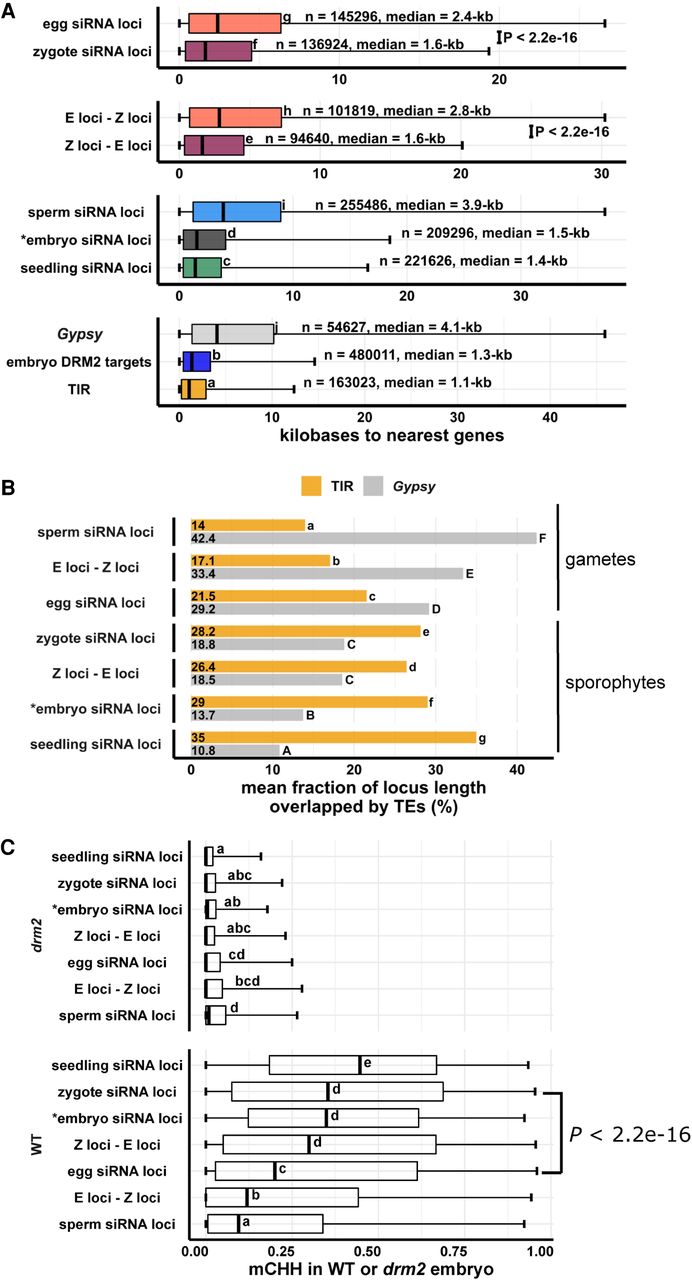 Newly detected siRNA loci in zygote reset to the canonical siRNA profile and predict CHH methylation in embryo in an RdDM-dependent manner. (A) Box plots showing distance of siRNA loci to nearest genes. Middle lines are medians. Boxes span interquartile range. Whiskers span 2.5th and 97.5th percentiles. (B) Bar plots showing mean locus length overlapped by TIR transposon or Gypsy retrotransposons across siRNA loci categories. Statistical comparisons are made across siRNA loci categories within a TE length category. (C) Box plots showing CHH methylation level in mature wild-type and drm2 mutant embryos. Middle lines are medians. Boxes span interquartile range. Whiskers span 2.5th and 97.5th percentiles. E-Z loci: n = 101,841, Z-E loci: n = 94,591 (69% of all zygote siRNA loci). Letter groupings (α = 0.05) and P-values are based on Tukey tests. (*) Embryo siRNA data from Rodrigues et al. (2013), which was based on a single replicate. Seedling, gametes, and prefertilization ovary data from Li et al. (2020).