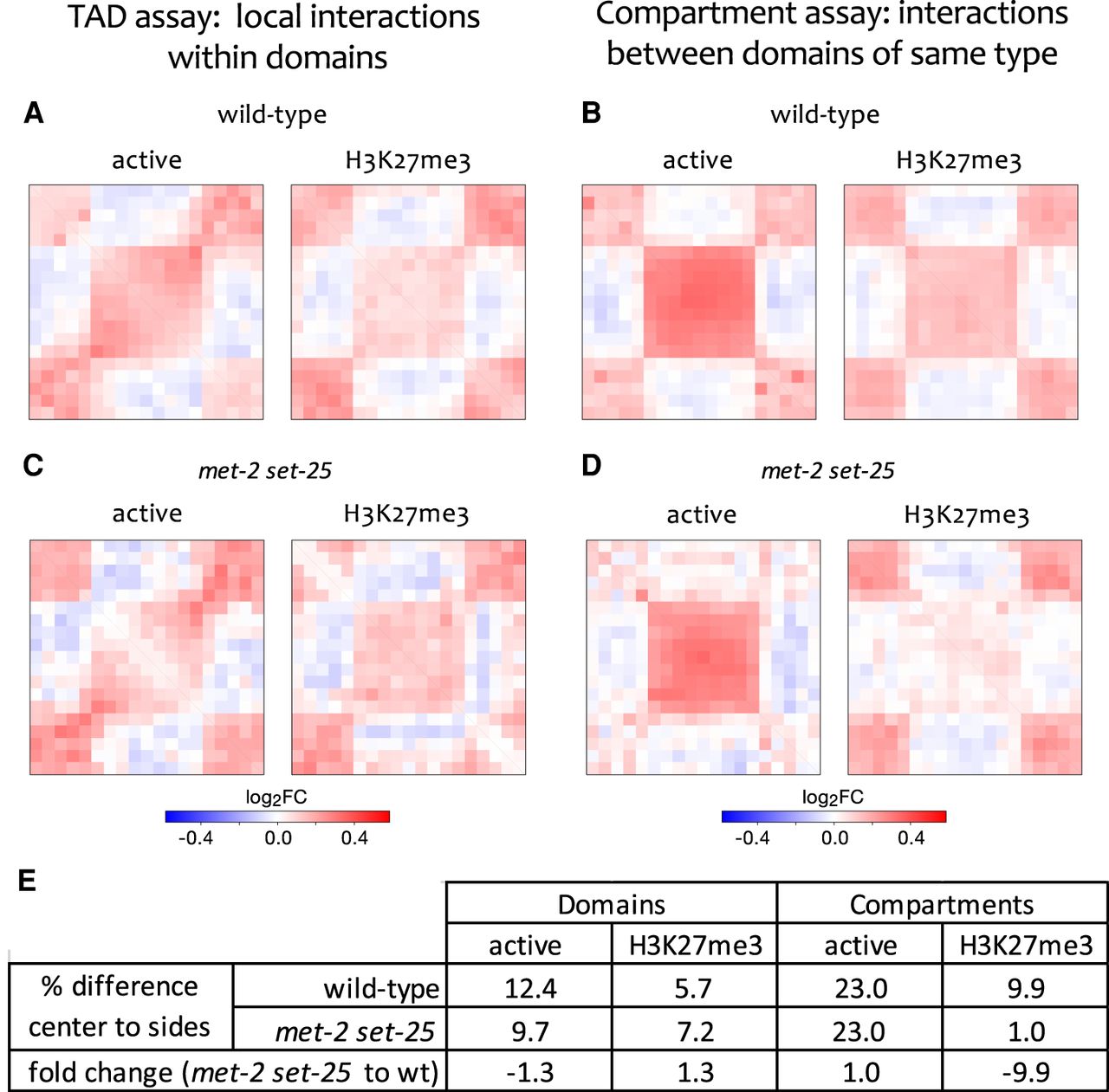 Chromatin modification domains form TADs that have compartment structure. (A,C) Active and H3K27me3 chromatin modification domains were aligned and contact map signal aggregated in the aligned regions and neighboring regions. Higher signal in the central square shows enrichment for within domain interactions, indicative of TAD structure. (B,D) All possible pairs of inter-domain contacts in the range of 50 kb to 2 M were aligned and signal aggregated as in A and C. Higher signal in the central square shows that domains interact more frequently with domains of the same type than with domains of opposite types, indicative of compartment structure. (E) Quantification of enrichment in contact frequencies (as percent differences) for domains and compartments in wild-type and met-2 set-25 mutants. For domains, the percent difference in contact frequency within domains versus neighboring regions is shown. For compartments, the percent difference in contact frequency between domains of the same type versus domains of different type is shown. See Methods for details.