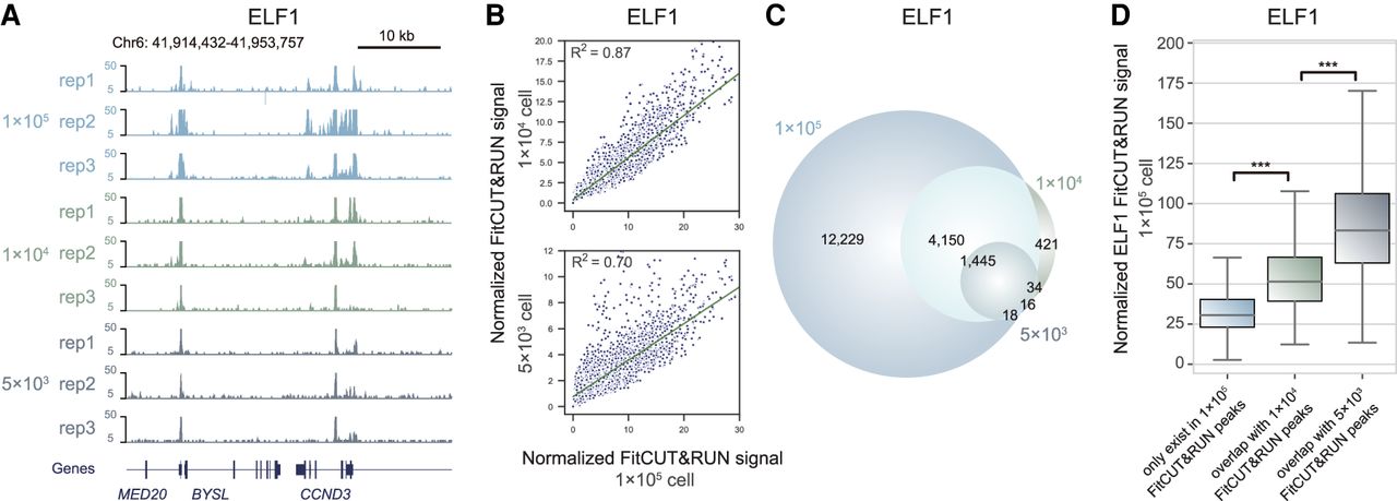Robustness of FitCUT&RUN with reduced input material in K562 cells. (A) The genome browser view shows the ELF1 FitCUT&RUN signal for different input materials (three replicates for each). A similar signal represents the reproducibility of FitCUT&RUN with low-input material. (B) Scatterplots presenting the high correlation of the ELF1 FitCUT&RUN signal between different input materials. (C) Venn diagram showing the overlap of ELF1 FitCUT&RUN peaks with different input cells. The majority of peaks based on the low-input material showed high overlap with those obtained from 1 × 105 cells. (D) Box plots showing the normalized ELF1 FitCUT&RUN signal using 1 × 105 cells in three groups of peaks, that is, only detected in the FitCUT&RUN using 1 × 105 cells, overlap with FitCUT&RUN using 1 × 104 cells, and overlap with FitCUT&RUN using 5 × 103 cells. Peaks detected with reduced input material (5 × 103 cells) show a higher signal than those in the other two groups, proving the reliability of FitCUT&RUN with low-input material.