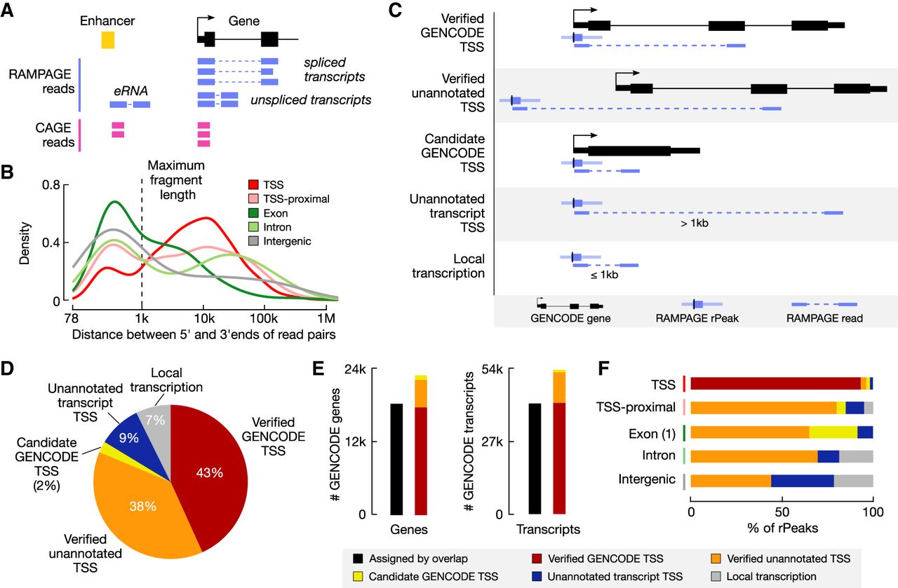 Assigning RAMPAGE rPeaks to genes using paired-end reads. (A) Schematic showing how paired-end RAMPAGE reads (purple) can distinguish between spliced and unspliced transcripts, unlike single-end CAGE reads (pink). (B) Density plot of the distances between the 5′ and 3′ ends of RAMPAGE read pairs, stratified by rPeak genomic context. The maximum fragment length (1 kb) is shown by the dashed line. (C) Schematic depicting the paired-end read method for linking RAMPAGE rPeaks with genes and the resulting five categories. (D) Pie chart displaying the percentage of RAMPAGE rPeaks classified as the five categories in C: verified GENCODE TSSs (red), verified unannotated TSSs (orange), candidate GENCODE TSSs (yellow), unannotated transcript TSSs (blue), or local transcription (gray). (E) Bar graphs showing the number of GENCODE genes (left) and transcripts (right) that are accounted for by overlapping RAMPAGE rPeaks (black) versus the paired-end read method illustrated in A and C (colors). Bars for the paired-end method are stratified by TSS class (as defined in C,D). Genes with multiple TSSs were counted only once with the following priority: verified GENCODE TSSs, verified unannotated TSSs, and then candidate GENCODE TSSs. (F) Bar graphs showing the percentage of rPeaks that are classified as verified GENCODE TSSs (red), verified unannotated TSSs (orange), candidate GENCODE TSSs (yellow), unannotated transcript TSSs (blue), or local transcription (gray), stratified by genomic context.