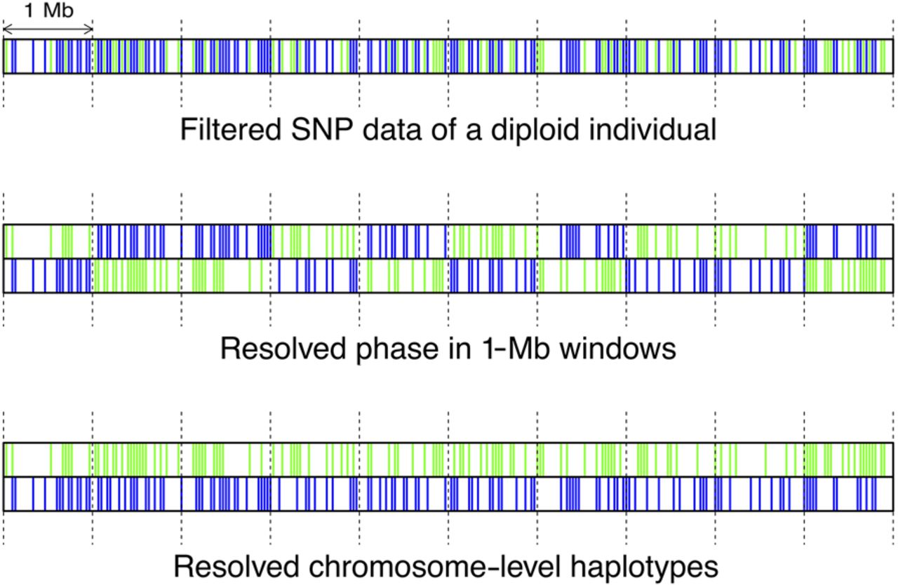 A schematic overview of two-step phasing. Green and blue lines represent nonreference SNP alleles from the two haplotypes of a single diploid individual.