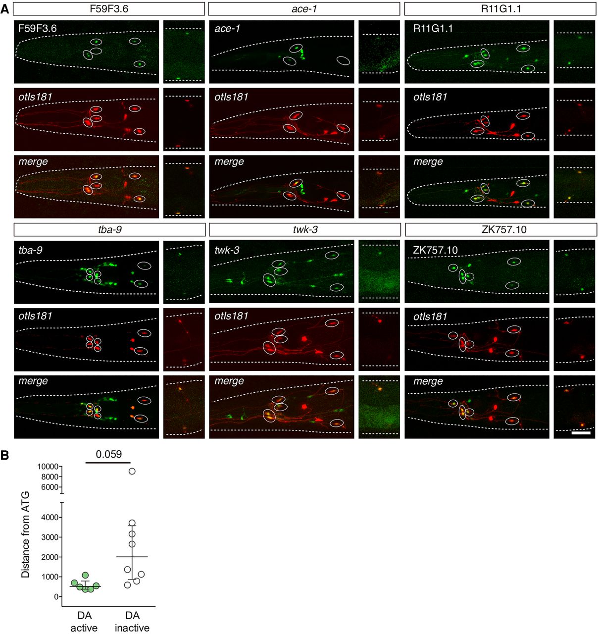 Experimental validation of dopaminergic regulatory signature. (A) Representative micrographs showing GFP expression driven by six different genomic regions overlapping predicted dopaminergic regulatory signature windows. Dopaminergic expression was assessed by colocalization with otIs181 reporter (dat-1p::mcherry; ttx-3p::mcherry) shown in red. Except for F59F3.6, which is exclusively expressed in dopaminergic neurons, GFP expression was also found in additional unidentified and reporter-specific neurons in the head. See Supplemental Table S8 for quantification of two independent reporter lines for each construct. Scale: 25 µm. (B) Distance from the central location of the construct to ATG. Constructs driving GFP expression in dopaminergic neurons tend to locate at closer distances to the ATG than those not active in dopaminergic neurons. Two-tailed t-test.