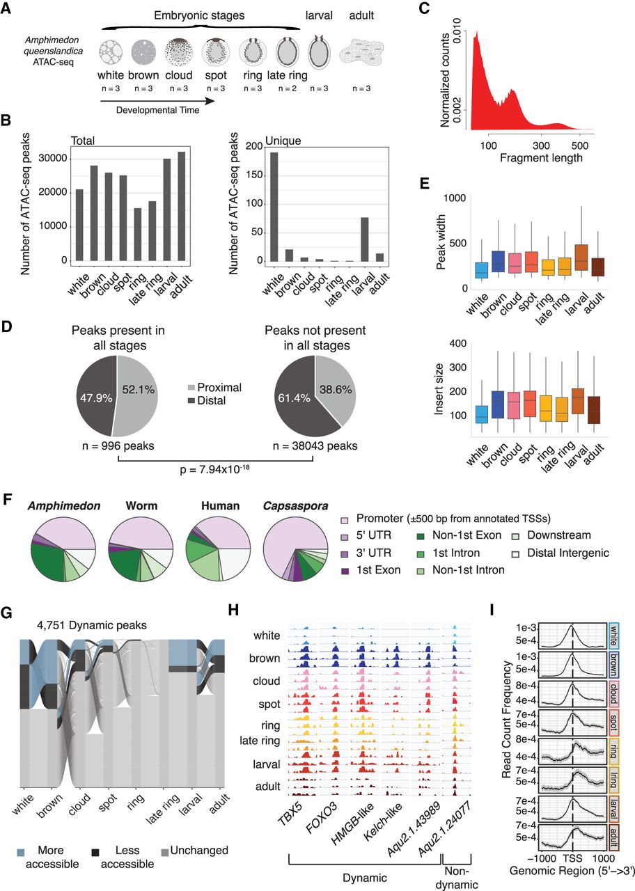 Overview of Amphimedon cis-regulatory regions. (A) Amphimedon queenslandica developmental stages. The number of ATAC-seq libraries for every developmental stage is shown. (B) Total and unique number of ATAC-seq peaks by developmental stage. Numbers for each stage calculated using the arithmetic mean across replicates. A peak must have at least a normalized count above 10 in at least one stage. Summary plot across stages required peaks with a mean count per million above zero across all replicates for each stage. (C) Density plot of ATAC-seq fragment length (base pair). (D) Pie charts show the number of proximal (within 500 bp of the TSS) and distal peaks for (1) constitutively open peaks and (2) those not accessible in all developmental stages. χ2 test was used to compute P-value. Accessible peaks across all stages: over zero normalized counts across all libraries. Peaks with varying accessibility in all stages: normalized count over one in three or more libraries. (E) Boxplot of ATAC-seq peak width and insert size. Numbers for each stage calculated using the arithmetic mean across replicates. (F) Distribution of Amphimedon, C. elegans, human, and Capsaspora ATAC-seq peaks across genomic features (Buenrostro et al. 2013; Sebé-Pedrós et al. 2016; Daugherty et al. 2017). Promoter region is defined as a region within 500 bp of the TSS for all species. Downstream is defined as ≤300 bp of the end of a gene. (G) Alluvial plot shows peak dynamics across life stages for peaks that change between at least one life stage (n = 4751) (n = 808, 1422, 334, 202, 3, 0, 851, and 509 more-accessible peaks for white, brown, cloud, spot, ring, late ring, larval, and adult, respectively; n = 1422, 808, 693, 213, 48, 0, 202, and 563 less-accessible peaks for the same stages). Differential accessibility determined by beta-binomial model (Methods). (H) Genome browser view of read coverage at selected dynamically accessible regions (TBX5: Aqu2.1.27488; FOXO3: Aqu2.1.27411; HMGB-like: Aqu2.1.41331; Kelch-like: Aqu2.1.41157; Aqu2.1.43989) and a selected consistently accessible peak (Aqu2.1.24077) across all life stages. (I) Chromatin accessibility read density around the TSS (within 1 kb) by life stage. Peaks were used only if at least 50% of bases overlapped across biological replicates.