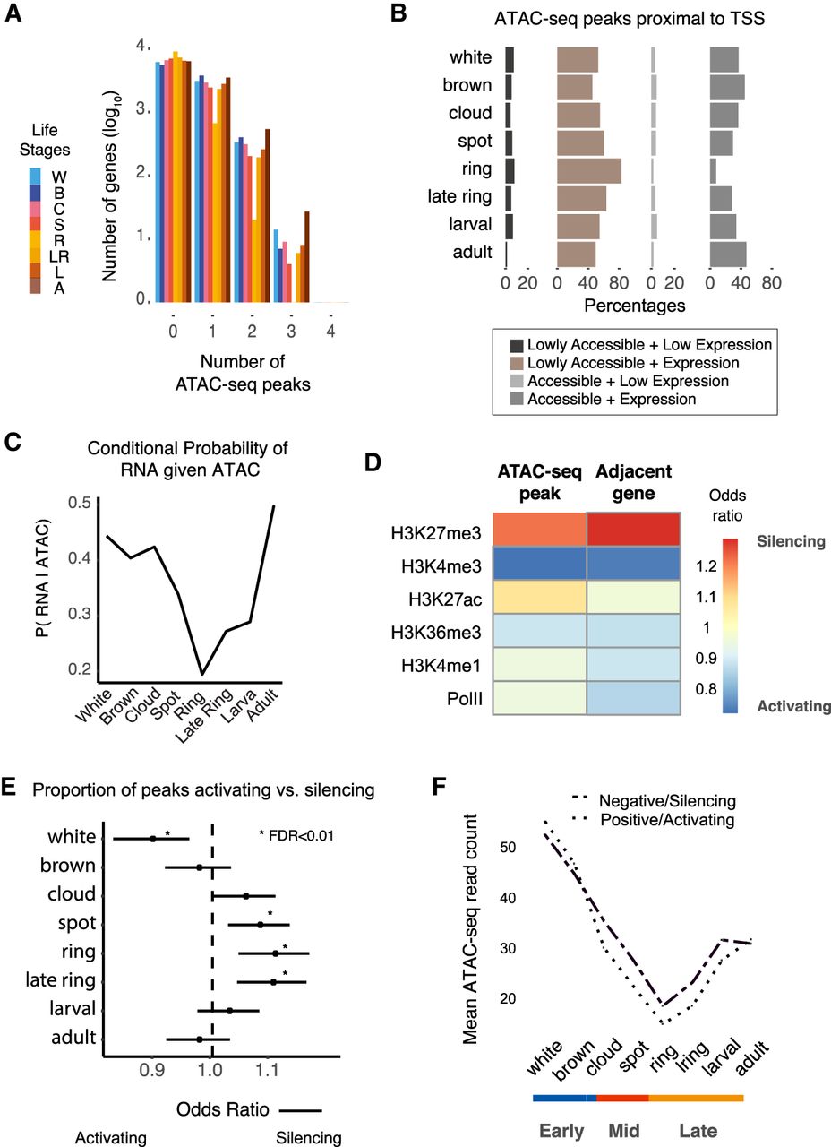 Interplay between transcription and proximal cis-regulatory elements. (A) Number of cis-regulatory peaks near Amphimedon genes (flanking 1 kb of the TSS). Number of genes was log10-transformed. (B) Percentage of chromatin-accessible/inaccessible peaks near expressed/unexpressed genes for each life stage (flanking 1 kb of the TSS) (expressed genes were defined as those with one or more median cpm in stage; accessible peaks were those with one or more median normalized counts in every stage). (C) Conditional probability of gene expression given proximal ATAC-seq accessibility. (D) Heatmap denotes the ratio between silencer and active sets of peaks and proximal genes overlapping adult Amphimedon histone marks and PolII binding sites. Peak and gene are considered active if there is a positive association between chromatin accessibility and gene expression across time. Silencers are defined as those negatively associated between ATAC-seq peak and gene. (E) Forest plot shows the proportion of peaks that are active versus repressive at each life stage. Fisher's exact tests are used to assess the significance of change relative to the total number of active and repressive peaks identified. Bars denote 95% confidence intervals. (F) Change in average chromatin accessibility read counts for active and silencer peaks.