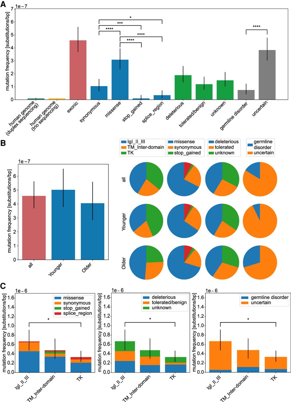 Analysis of mutation frequencies in FGFR3. Overall mutation frequencies estimated as number of variants (considered as DNM) divided by the number of sequenced nucleotides of the targeted regions. (A) Mutation frequencies (substitutions per base pair) measured in the human genome by duplex sequencing (Abascal et al. 2021) and trio sequencing (Kong et al. 2012) and compared with the exonic regions of FGFR3 (n = 92). We further subdivided the exonic mutations in the type of amino acid substitution (synonymous n = 21, missense n = 62, stop_gained n = 2, splice_region n = 7), in the effect on the protein based on the SIFT score (deleterious n = 38, tolerated/benign n = 24, unknown n = 30), or with a phenotype according to the HGMD database (germline disorder n = 15, uncertain n = 77) listed in detail in Supplemental Table S1. (B) Age dependency. Mutation frequencies compared between donor groups (all n = 92, younger n = 55, older n = 37). The pie charts are based on the mutation frequency for each group. (C) Domain analysis. Mutation frequencies compared among protein domains (IgI-III n = 38, TM_inter-domain n = 21, TK n = 33) categorized after substitution type, deleteriousness, and associated germline disorder. Error bars are confidence intervals of a Poisson distribution. For pairwise testing, the Chi-square test with Bonferroni–Holm correction was used, and only significant differences are shown in B and C. (*) P-value < 0.05; (****) P-value < 0.0001; (n.s.) P-value ≥ 0.05.