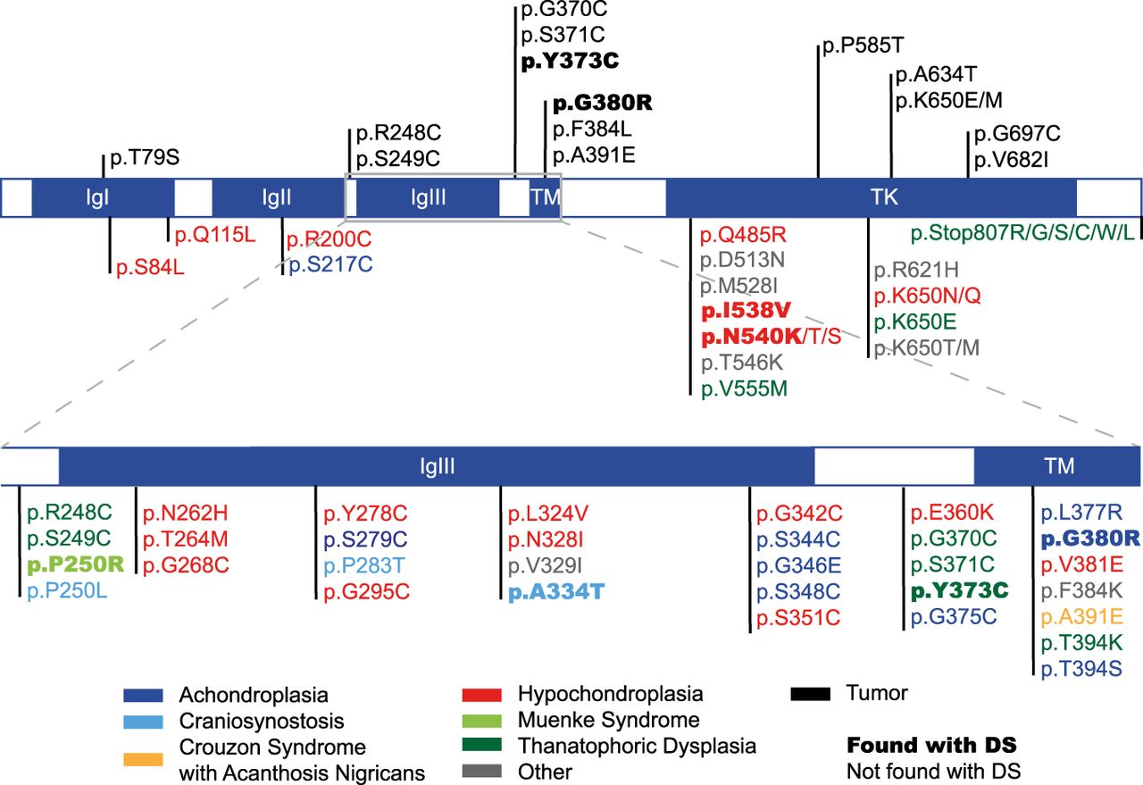 FGFR3 variants associated with germline disorders and/or tumors. Shown are FGFR3 protein domains and associated variants documented to cause germline disorders (color-coded like the respective disorder) according to the HGMD database and the variants with the most counts in the COSMIC database. Variants captured with our DS approach are highlighted in bold. (IgI-III) Immunoglobulin-like domain I-III, (TM) transmembrane domain, and (TK) tyrosine kinase domain.