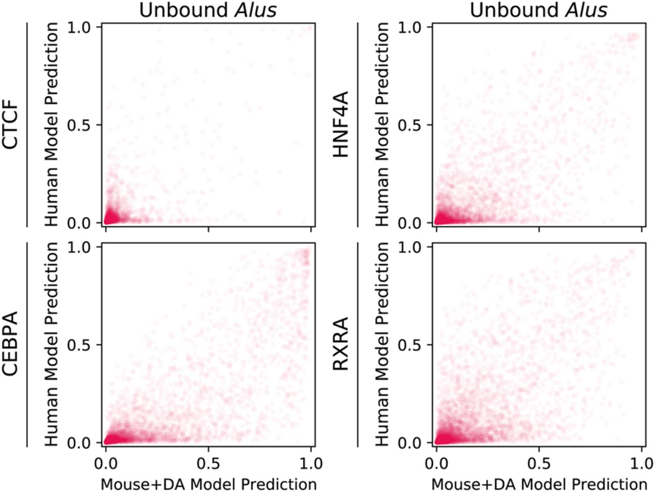 Differential predictions of unbound sites containing Alu elements between domain-adaptive mouse-trained models and human-trained models. Unlike the original mouse models, domain-adaptive mouse models do not show systematic overprediction of Alu repeats.