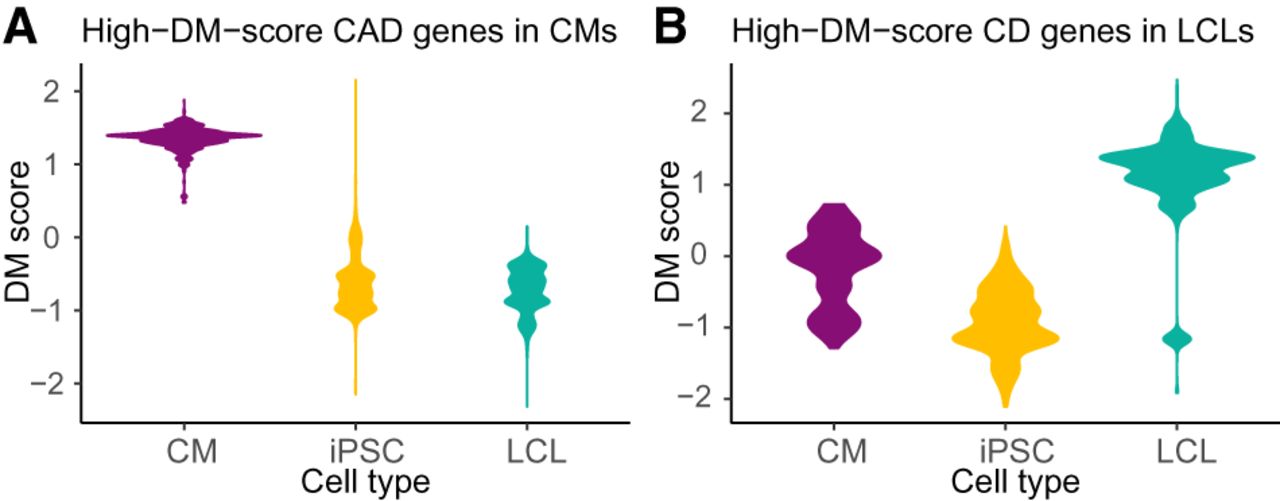 Variant-disrupted disease genes affect the modularity of the individual's regulatory network in the relevant cell type. Differential modularity (DM) scores indicate the extent to which a gene's modular environment in the network changes between the genotype-specific EGRET network and the genotype-agnostic network. (A) CAD-related genes with high DM scores in cardiomyocytes (CMs) have low DM scores in the other cell types. (B) CD-related genes with high DM scores in LCLs have low scores in the other cell types (see Supplemental Table S2).