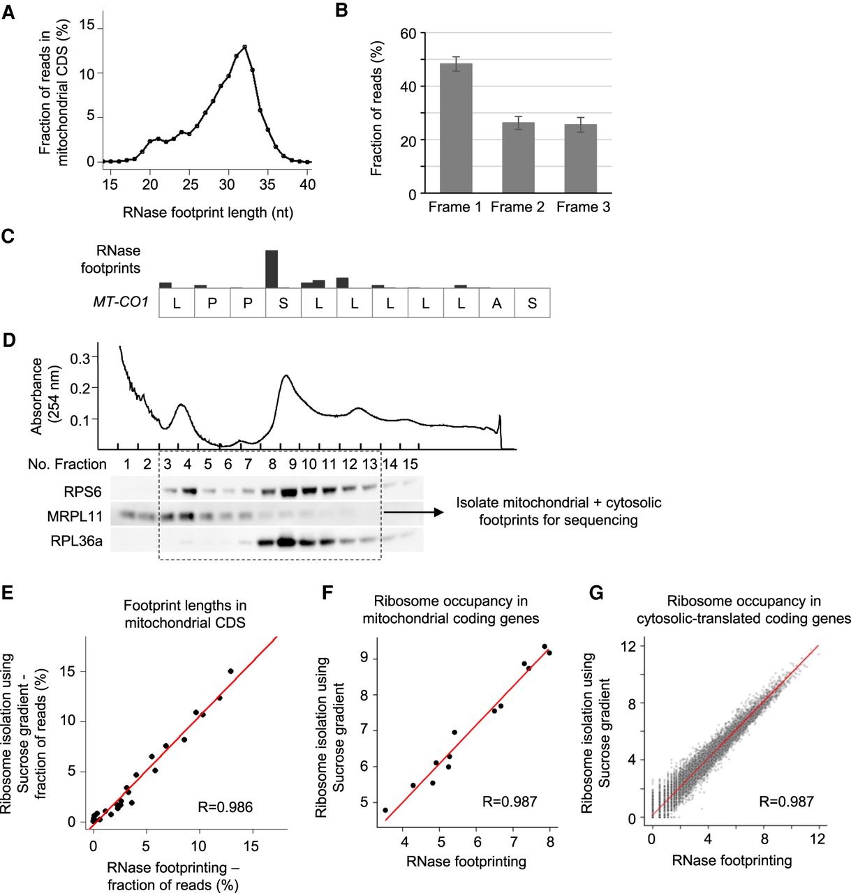 RNase footprinting examines mitochondrial translation. (A) The distribution of footprint lengths across mitochondrial protein-coding regions. (B) The fractions of reads in the three codon frames. The 32-nt-long footprints (the peak size) in mitochondrial coding regions were used for the calculation. The SD represents the variation across 13 mitochondria-encoded protein-coding genes. (C) An example transcript region of MT-CO1, showing the 3-nt periodicity of read distribution. (D) We used the sucrose gradient to isolate 55S mitoribosome and 80S ribosome complexes and then extracted associated footprints for sequencing. We performed western blots for ribosomal proteins to show the fractions containing 55S mitoribosomes and 80S ribosomes. (E) The correlation of footprint length distribution in mitochondrial coding regions calculated using our RNase footprinting and sucrose gradient-based ribosome profiling. (F,G) The correlation of ribosome occupancies in mitochondrial-encoded (F) and nuclear-encoded (G) coding genes calculated using the two methods. The RNase footprinting data using 50,000 HEK293T cells were used for the analyses.