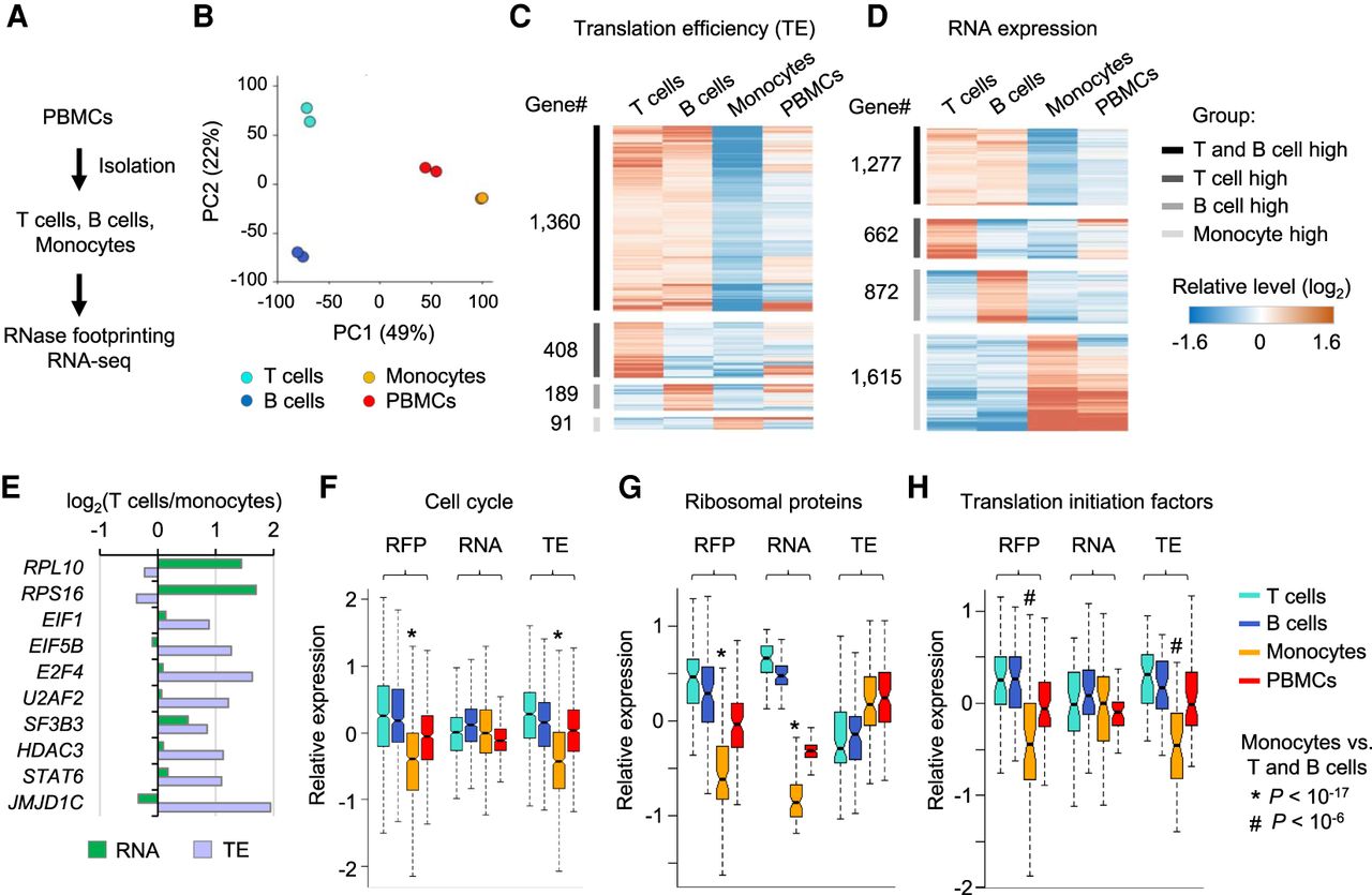 Regulation of RNA translation across human primary immune cell types. (A) Experimental steps to isolate T cells, B cells, and monocytes from PBMCs and then perform RNase footprinting and RNA-seq. (B) The principal component analysis (PCA) of ribosome occupancies of T cells, B cells, monocytes, and PBMCs. Genes showing more than twofold regulation across cells were used in the analyses. The percentages of variance explained by PC1 and PC2 are shown in parentheses. (C,D) The heatmap showing genes with regulation of translation efficiency (C) and RNA expression (D) comparing T cells, B cells, and monocytes. (E) Example genes showing differential RNA expression and translation efficiency, comparing T cells versus monocytes. (F–H) Boxplots showing the relative levels of ribosome occupancy (RFP), RNA expression, and translation efficiency (TE) for indicated genesets comparing T cells, B cells, monocytes, and PBMCs: “cell cycle” (F), “ribosomal proteins” (G), and “translation initiation factors” (H). The * or # label indicates the Wilcoxon rank-sum test P-value showing the geneset has significantly lower expression in monocytes, compared with both T cells and B cells.